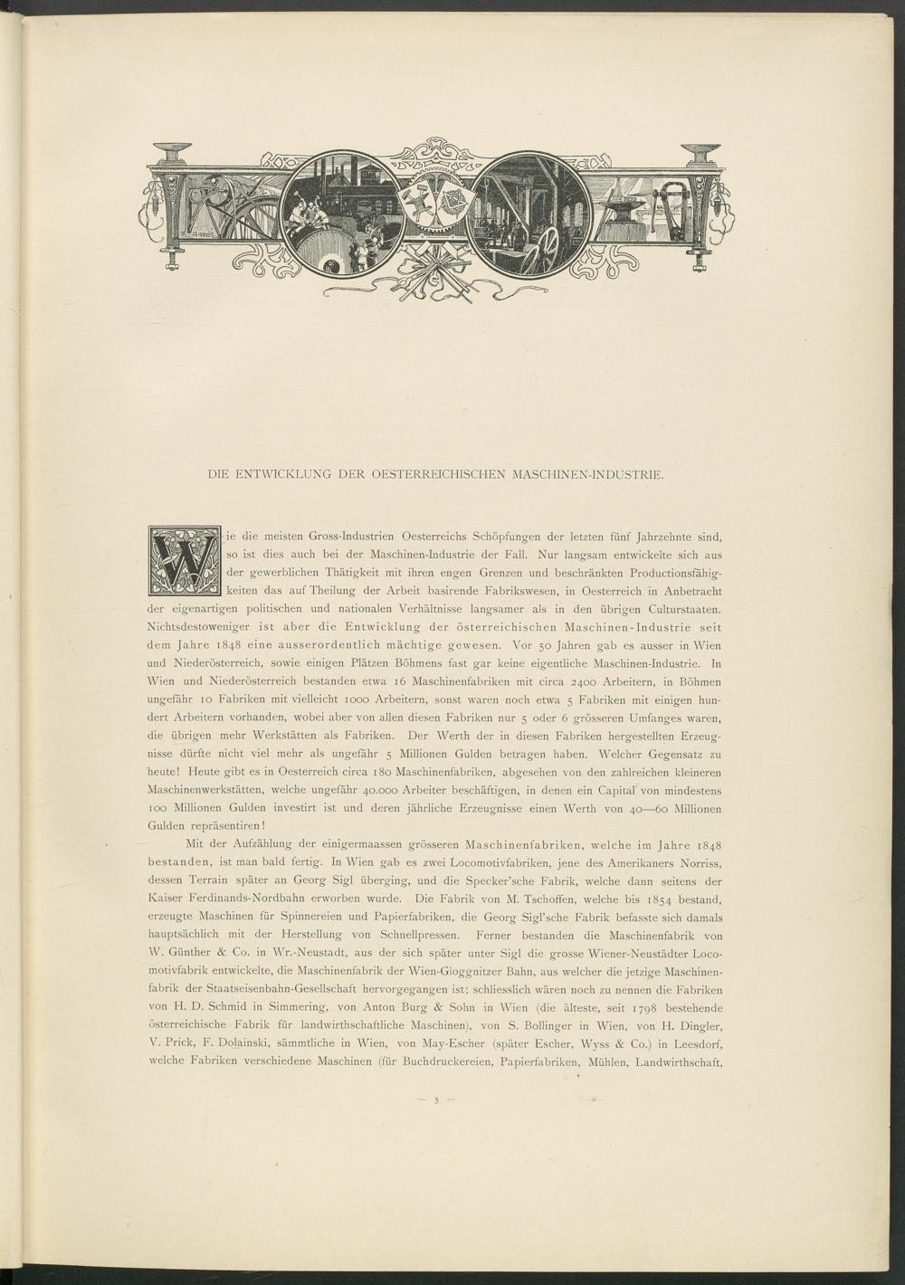 Mit der Aufzählung der einigermaassen grösseren Maschinenfabriken, welche im Jahre 1848 bestanden, ist man bald fertig. In Wien gab es zwei Locomotivfabriken, jene des Amerikaners Norriss, dessen Terrain später an Georg Sigl überging, und die Specker’sche Fabrik, welche dann seitens der Kaiser Ferdinands-Nordbahn erworben wurde. Die Fabrik von M. Tschoffen, welche bis 1854 bestand, erzeugte Maschinen für Spinnereien und Papierfabriken, die Georg Sigl’sche Fabrik befasste sich damals hauptsächlich mit der Flerstellung von Schnellpressen. Ferner bestanden die Maschinenfabrik von W. Günther & Co. in Wr.-Neustadt, aus der sich später unter Sigl die grosse Wiener-Neustädter Loco- motivfabrik entwickelte, die Maschinenfabrik der Wien-Gloggnitzer Bahn, aus welcher die jetzige Maschinenfabrik der Staatseisenbahn-Gesellschaft hervorgegangen ist; schliesslich wären noch zu nennen die Fabriken von H. D. Schmid in Simmering, von Anton Burg & Sohn in Wien (die älteste, seit 1798 bestehende österreichische Fabrik für landwirthschaftliche Maschinen), von S. Bollinger in Wien, von H. Dingler, V. Prick, F. Dolainski, sämmtliche in Wien, von May-Escher (später Escher, Wyss & Co.) in Leesdorf, welche Fabriken verschiedene Maschinen (für Buchdruckereien, Papierfabriken, Mühlen, Landwirthschaft,