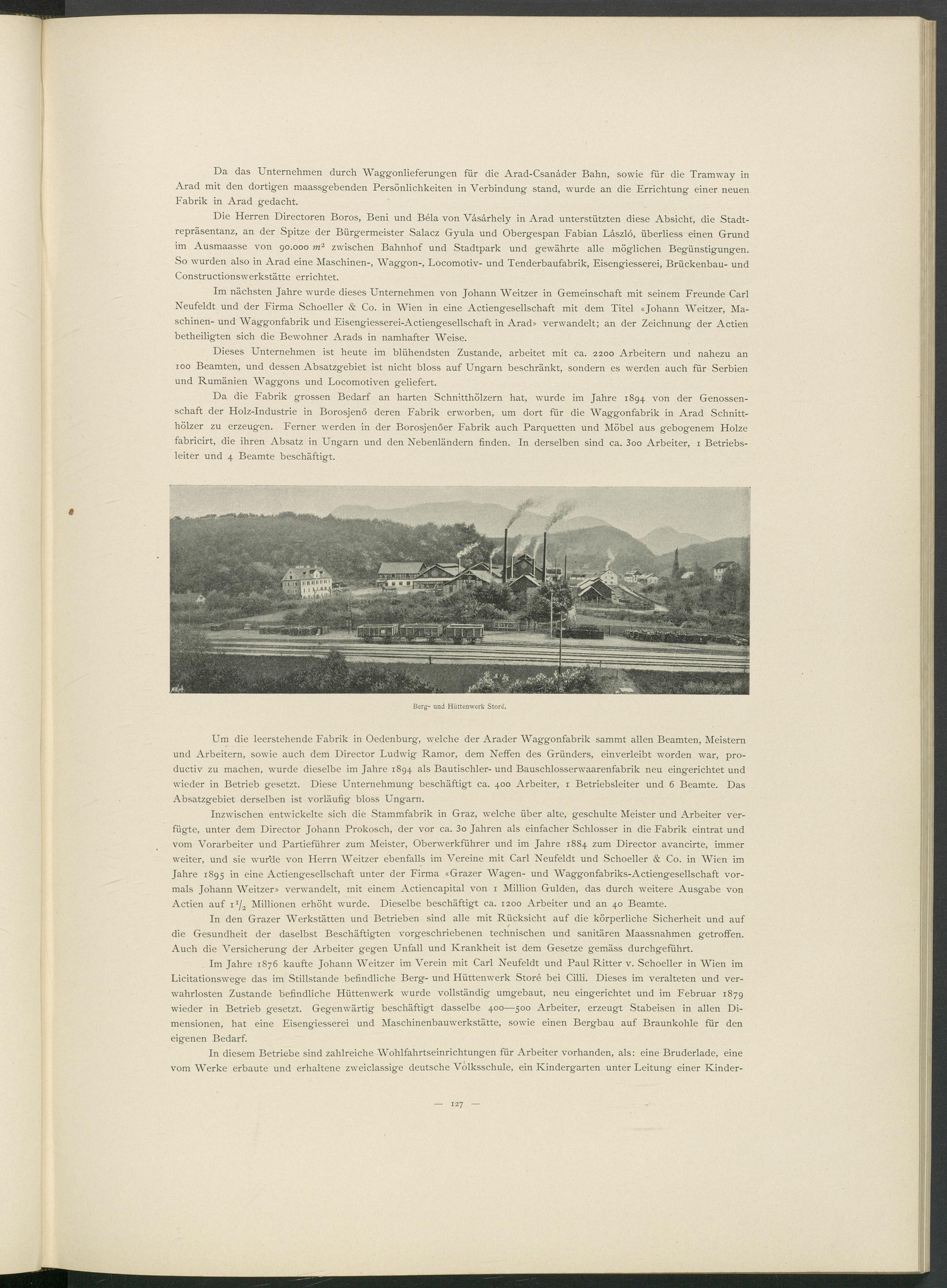 Inzwischen entwickelte sich die Stammfabrik in Graz, welche über alte, geschulte Meister und Arbeiter verfügte, unter dem Director Johann Prokosch, der vor ca. 3o Jahren als einfacher Schlosser in die Fabrik eintrat und vom Vorarbeiter und Partieführer zum Meister, Oberwerkführer und im Jahre 1884 zum Director avancirte, immer weiter, und sie wurde von Herrn Weitzer ebenfalls im Vereine mit Carl Neufeldt und Schoeller & Co. in Wien im Jahre 1895 in eine Actiengesellschaft unter der Firma «Grazer Wagen- und Waggonfabriks-Actiengesellschaft vormals Johann Weitzer» verwandelt, mit einem Actiencapital von 1 Million Gulden, das durch weitere Ausgabe von Actien auf 1 1 j 2 Millionen erhöht wurde. Dieselbe beschäftigt ca. 1200 Arbeiter und an 40 Beamte.