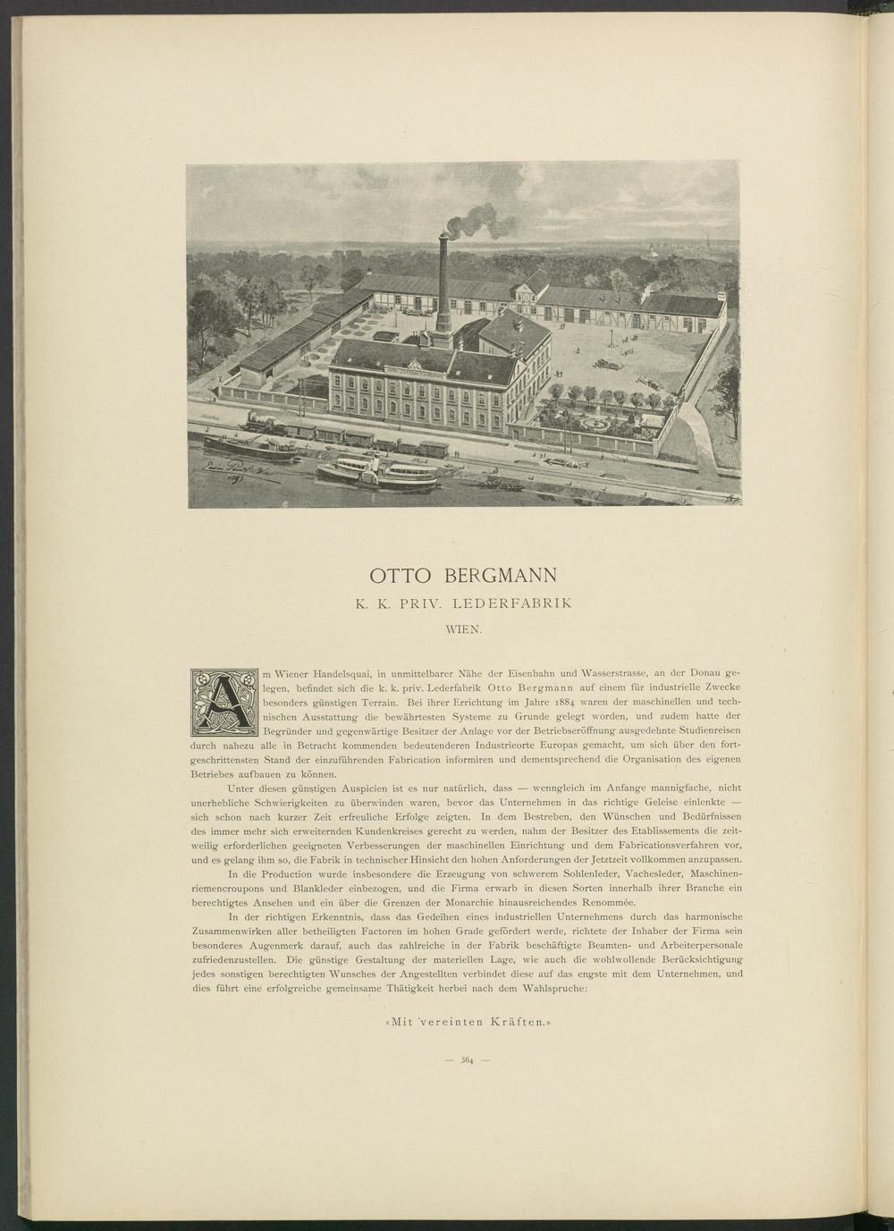 m Wiener Handelsquai, in unmittelbarer Nähe der Eisenbahn und Wasserstrasse, an der Donau gelegen, befindet sich die k. k. priv. Lederfabrik Otto Bergmann auf einem für industrielle Zwecke besonders günstigen Terrain. Bei ihrer Errichtung im Jahre 1884 waren der maschinellen und technischen Ausstattung die bewährtesten Systeme zu Grunde gelegt worden, und zudem hatte der Begründer und gegenwärtige Besitzer der Anlage vor der Betriebseröffnung ausgedehnte Studienreisen durch nahezu alle in Betracht kommenden bedeutenderen Industrieorte Europas gemacht, um sich über den fortgeschrittensten Stand der einzuführenden Fabrication informiren und dementsprechend die Organisation des eigenen Betriebes aufbauen zu können.