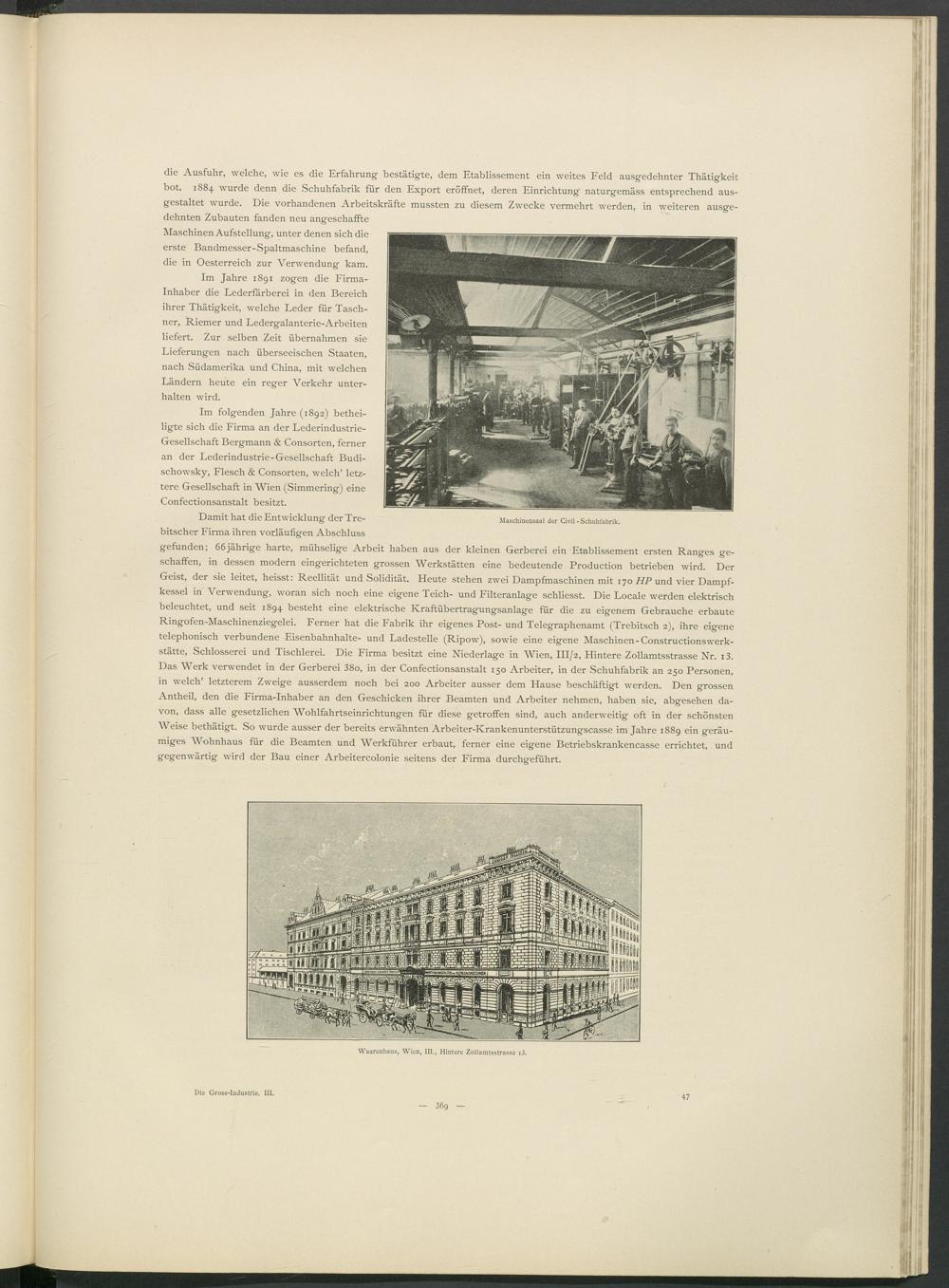 Damit hat die Entwicklung der Tre- bitscher Firma ihren vorläufigen Abschluss gefunden; 66jährige harte, mühselige Arbeit haben aus der kleinen Gerberei ein Etablissement ersten Ranges geschaffen, in dessen modern eingerichteten grossen Werkstätten eine bedeutende Production betrieben wird. Der Geist, der sie leitet, heisst: Reellität und Solidität. Heute stehen zwei Dampfmaschinen mit 170 HP und vier Dampfkessel in Verwendung, woran sich noch eine eigene Teich- und Filteranlage schliesst. Die Locale werden elektrisch beleuchtet, und seit 1894 besteht eine elektrische Kraftübertragungsanlage für die zu eigenem Gebrauche erbaute Ringofen-Maschinenziegelei. Ferner hat die Fabrik ihr eigenes Post- und Telegraphenamt (Trebitsch 2), ihre eigene telephonisch verbundene Eisenbahnhalte- und Ladestelle (Ripow), sowie eine eigene Maschinen - Constructionswerk- stätte, Schlosserei und Tischlerei. Die Firma besitzt eine Niederlage in Wien, III/2, Hintere Zollamtsstrasse Nr. i3. Das Werk verwendet in der Gerberei 38o, in der Confectionsanstalt 150 Arbeiter, in der Schuhfabrik an 250 Personen, in welch’ letzterem Zweige ausserdem noch bei 200 Arbeiter ausser dem Hause beschäftigt werden. Den grossen Antheil, den die Firma-Inhaber an den Geschicken ihrer Beamten und Arbeiter nehmen, haben sie, abgesehen davon, dass alle gesetzlichen Wohlfahrtseinrichtungen für diese getroffen sind, auch anderweitig oft in der schönsten Weise bethätigt. So wurde ausser der bereits erwähnten Arbeiter-Krankenunterstützungscasse im Jahre 1889 ein geräumiges Wohnhaus für die Beamten und Werkführer erbaut, ferner eine eigene Betriebskrankencasse errichtet, und gegenwärtig wird der Bau einer Arbeitercolonie seitens der Firma durchgeführt.
