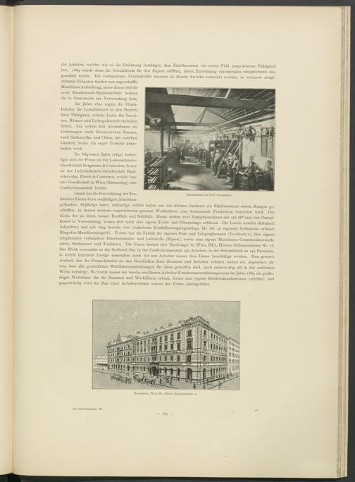 Im folgenden Jahre (1892) betheiligte sich die Firma an der Lederindustrie- Gesellschaft Bergmann & Consorten, ferner an der Lederindustrie-Gesellschaft Budi- schowsky, Flesch & Consorten, welch’ letztere Gesellschaft in Wien (Simmering) eine Confectionsanstalt besitzt.