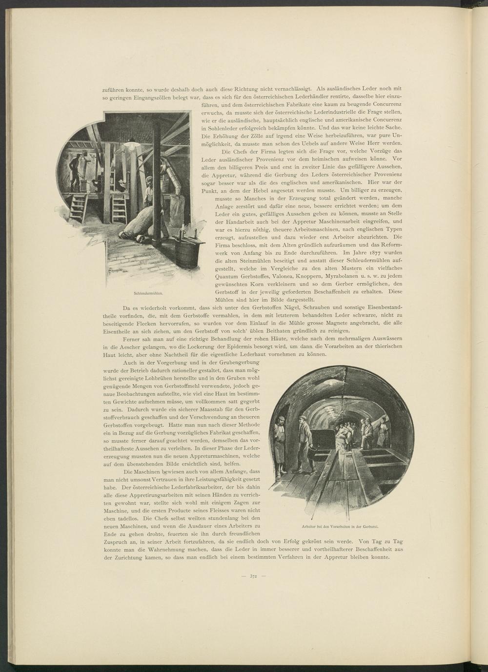Die Chefs der Firma legten sich die Frage vor, welche Vorzüge das Leder ausländischer Provenienz vor dem heimischen aufweisen könne. Vor allem den billigeren Preis und erst in zweiter Linie das gefälligere Aussehen, die Appretur, während die Gerbung des Leders österreichischer Provenienz sogar besser war als die des englischen und amerikanischen. Hier war der Punkt, an dem der Hebel angesetzt werden musste. Um billiger zu erzeugen, musste so Manches in der Erzeugung total geändert werden, manche Anlage zerstört und dafür eine neue, bessere errichtet werden; um dem Leder ein gutes, gefälliges Aussehen geben zu können, musste an Stelle der Handarbeit auch bei der Appretur Maschinenarbeit eingreifen, und war es hierzu nöthig, theuere Arbeitsmaschinen, nach englischen Typen erzeugt, aufzustellen und dazu wieder erst Arbeiter abzurichten. Die Firma beschloss, mit dem Alten gründlich aufzuräumen und das Reformwerk von Anfang bis zu Ende durchzuführen. Im Jahre 1877 wurden die alten Steinmühlen beseitigt und anstatt dieser Schleudermühlen aufgestellt, welche im Vergleiche zu den alten Mustern ein vielfaches Quantum Gerbstoffes, Valonea, Knoppern, Myrabolanen u. s. w. zu jedem gewünschten Korn verkleinern und so dem Gerber ermöglichen, den Gerbstoff in der jeweilig geforderten Beschaffenheit zu erhalten. Diese Mühlen sind hier im Bilde dargestellt.
