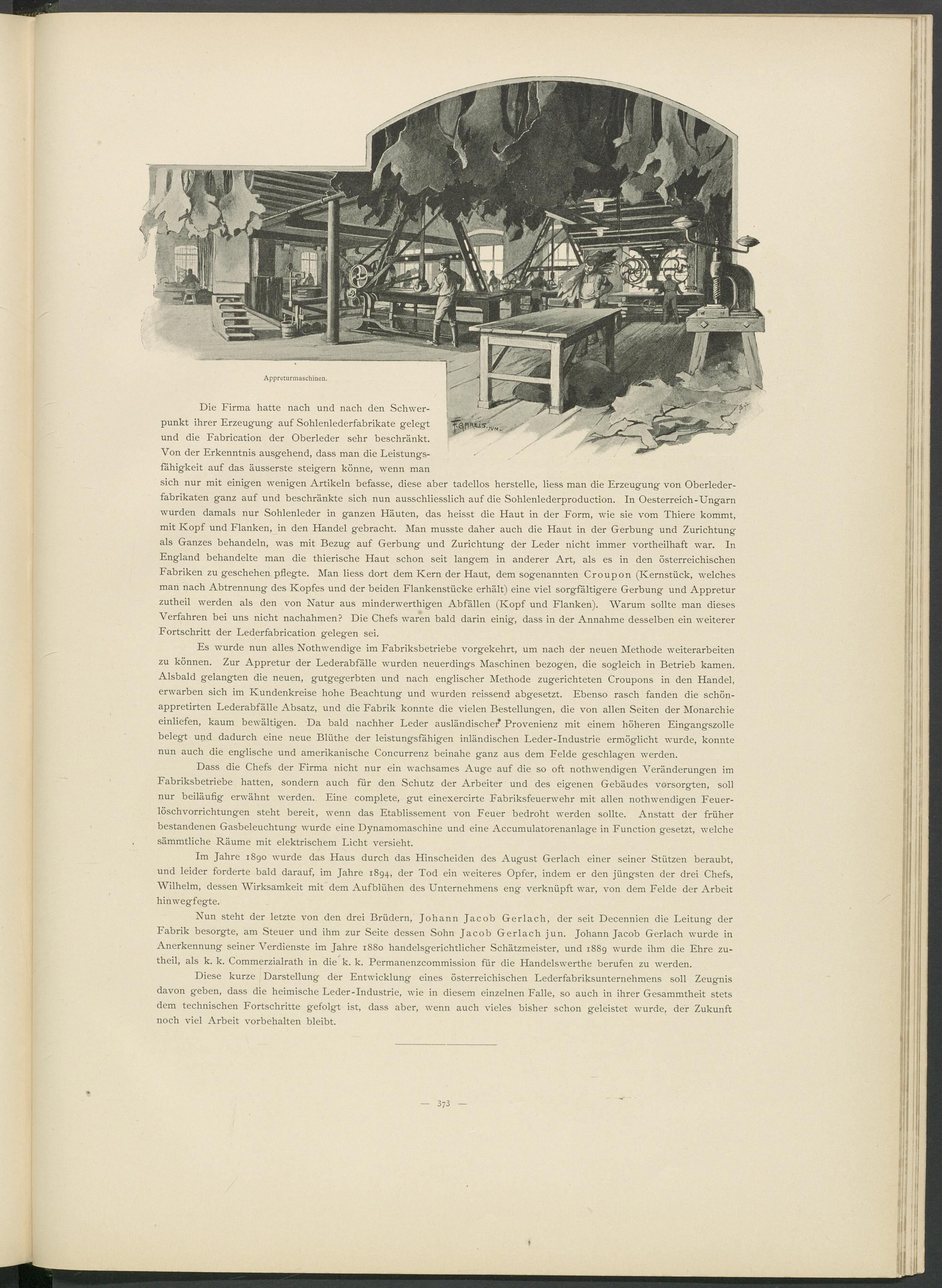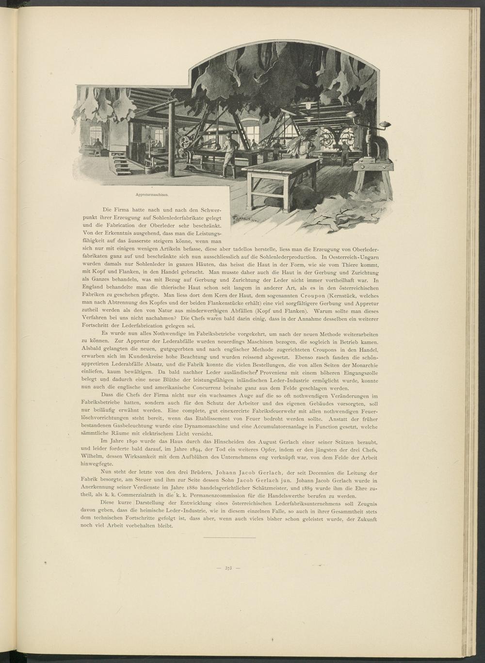 Es wurde nun alles Nothwendige im Fabriksbetriebe vorgekehrt, um nach der neuen Methode Weiterarbeiten zu können. Zur Appretur der Lederabfälle wurden neuerdings Maschinen bezogen, die sogleich in Betrieb kamen. Alsbald gelangten die neuen, gutgegerbten und nach englischer Methode zugerichteten Croupons in den Handel, erwarben sich im Kundenkreise hohe Beachtung und wurden reissend abgesetzt. Ebenso rasch fanden die schön- appretirten Lederabfälle Absatz, und die Fabrik konnte die vielen Bestellungen, die von allen Seiten der Monarchie einliefen, kaum bewältigen. Da bald nachher Leder ausländischer* Provenienz mit einem höheren Eingangszolle belegt und dadurch eine neue Blüthe der leistungsfähigen inländischen Leder-Industrie ermöglicht wurde, konnte nun auch die englische und amerikanische Concurrenz beinahe ganz aus dem Felde geschlagen werden.