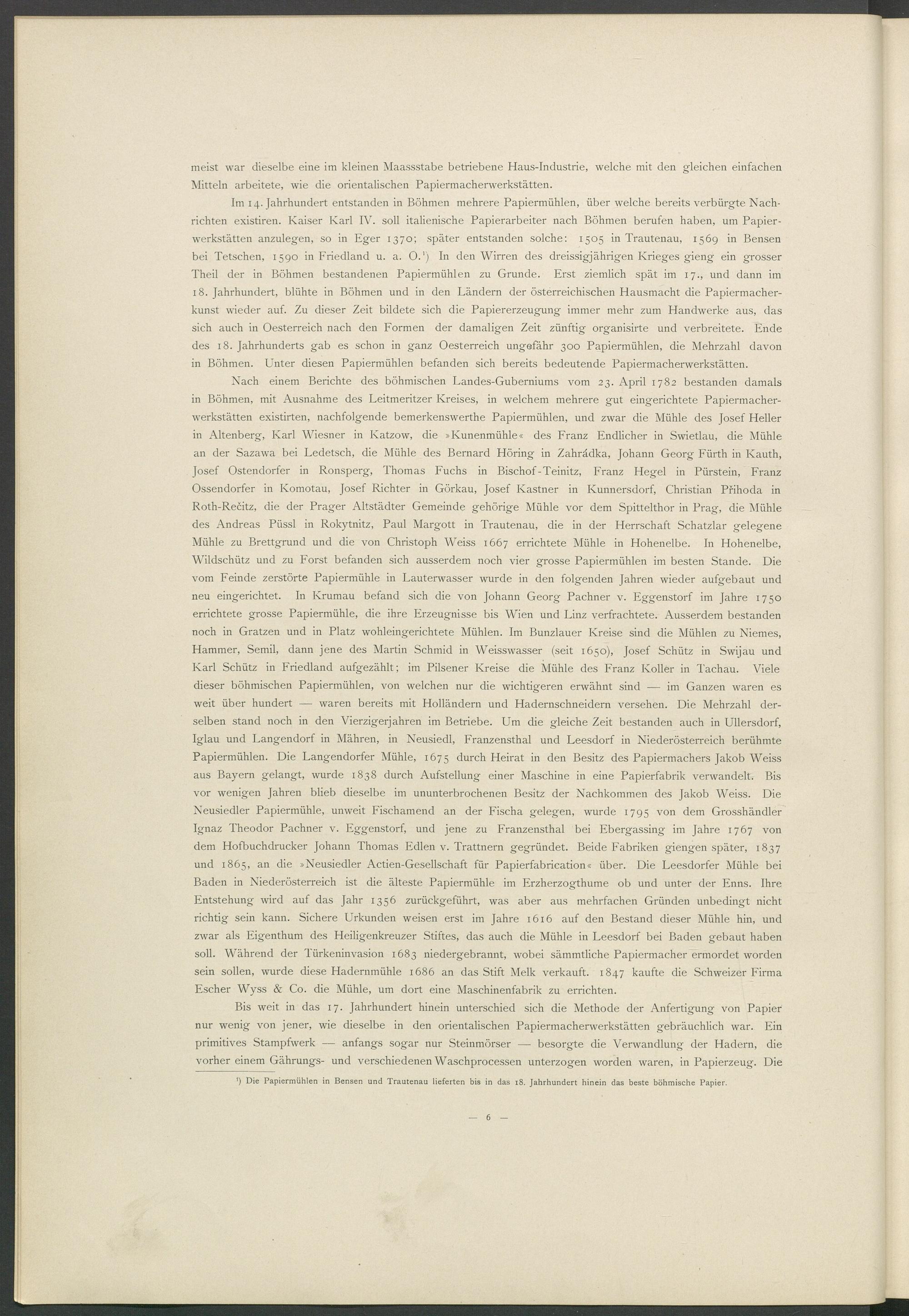 Nach einem Berichte des böhmischen Landes-Guberniums vom 23. April 1782 bestanden damals in Böhmen, mit Ausnahme des Leitmeritzer Kreises, in welchem mehrere gut eingerichtete Papiermacher­werkstätten existirten, nachfolgende bemerkenswerthe Papiermühlen, und zwar die Mühle des Josef Heller in Altenberg, Karl Wiesner in Katzow, die »Kunenmühle« des Franz Endlicher in Swietlau, die Mühle an der Sazawa bei Ledetsch, die Mühle des Bernard Höring in Zahrädka, Johann Georg Fürth in Kauth, Josef Ostendorfer in Ronsperg, Thomas Fuchs in Bischof-Teinitz, Franz Hegel in Pürstein, Franz Ossendorfer in Ivomotau, Josef Richter in Görkau, Josef Ivastner in Kunnersdorf, Christian Prihoda in Roth-Recitz, die der Prager Altstädter Gemeinde gehörige Mühle vor dem Spittelthor in Prag, die Mühle des Andreas Püssl in Rokytnitz, Paul Margott in Trautenau, die in der Herrschaft Schatzlar gelegene Mühle zu Brettgrund und die von Christoph Weiss 1667 errichtete Mühle in Hohenelbe. In Hohenelbe, Wildschütz und zu Forst befanden sich ausserdem noch vier grosse Papiermühlen im besten Stande. Die vom Feinde zerstörte Papiermühle in Lauterwasser wurde in den folgenden Jahren wieder aufgebaut und neu eingerichtet. In Krumau befand sich die von Johann Georg Pachner v. Eggenstorf im Jahre 1750 errichtete grosse Papiermühle, die ihre Erzeugnisse bis Wien und Linz verfrachtete. Ausserdem bestanden noch in Gratzen und in Platz wohleingerichtete Mühlen. Im Bunzlauer Kreise sind die Mühlen zu Niemes, Hammer, Semil, dann jene des Martin Schmid in Weisswasser (seit 1650), Josef Schütz in Swijau und Karl Schütz in Friedland aufgezählt; im Pilsener Kreise die Mühle des Franz Koller in Tachau. Viele dieser böhmischen Papiermühlen, von welchen nur die wichtigeren erwähnt sind im Ganzen waren es weit über hundert waren bereits mit Holländern und Hadernschneidern versehen. Die Mehrzahl der­selben stand noch in den Vierzigerjahren im Betriebe. Um die gleiche Zeit bestanden auch in Ullersdorf, Iglau und Langendorf in Mähren, in Neusiedl, Franzensthal und Leesdorf in Niederösterreich berühmte Papiermühlen. Die Langendorfer Mühle, 1675 durch Heirat in den Besitz des Papiermachers Jakob Weiss aus Bayern gelangt, wurde 1838 durch Aufstellung einer Maschine in eine Papierfabrik verwandelt. Bis vor wenigen Jahren blieb dieselbe im ununterbrochenen Besitz der Nachkommen des Jakob Weiss. Die Neusiedler Papiermühle, unweit Fischamend an der Fischa gelegen, wurde 1795 von dem Grosshändler Ignaz Theodor Pachner v. Eggenstorf, und jene zu Franzensthal bei Ebergassing im Jahre 1767 von dem Hofbuchdrucker Johann Thomas Edlen v. Trattnern gegründet. Beide Fabriken giengen später, 1837 und 1865, an die »Neusiedler Actien-Gesellschaft für Papierfabrication« über. Die Leesdorfer Mühle bei Baden in Niederösterreich ist die älteste Papiermühle im Erzherzogthume ob und unter der Enns. Ihre Entstehung wird auf das Jahr 1356 zurückgeführt, was aber aus mehrfachen Gründen unbedingt nicht richtig sein kann. Sichere Urkunden weisen erst im Jahre 1616 auf den Bestand dieser Mühle hin, und zwar als Eigenthum des Heiligenkreuzer Stiftes, das auch die Mühle in Leesdorf bei Baden gebaut haben soll. Während der Türkeninvasion 1683 niedergebrannt, wobei sämmtliche Papiermacher ermordet worden sein sollen, wurde diese Hadernmühle 1686 an das Stift Melk verkauft. 1847 kaufte die Schweizer Firma Escher Wyss & Co. die Mühle, um dort eine Maschinenfabrik zu errichten.