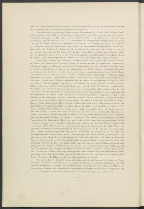 Im 14. Jahrhundert entstanden in Böhmen mehrere Papiermühlen, über welche bereits verbürgte Nach­richten existiren. Kaiser Karl IV. soll italienische Papierarbeiter nach Böhmen berufen haben, um Papier­werkstätten anzulegen, so in Eger 1370; später entstanden solche: 1505 in Trautenau, 1569 in Bensen bei Tetschen, 1590 in Friedland u. a. 0 .') In den Wirren des dreissigjährigen Krieges gieng ein grosser Theil der in Böhmen bestandenen Papiermühlen zu Grunde. Erst ziemlich spät im 17., und dann im 18. Jahrhundert, blühte in Böhmen und in den Ländern der österreichischen Hausmacht die Papiermacher­kunst wieder auf. Zu dieser Zeit bildete sich die Papiererzeugung immer mehr zum Handwerke aus, das sich auch in Oesterreich nach den Formen der damaligen Zeit zünftig organisirte und verbreitete. Ende des 18. Jahrhunderts gab es schon in ganz Oesterreich ungefähr 300 Papiermühlen, die Mehrzahl davon in Böhmen. Unter diesen Papiermühlen befanden sich bereits bedeutende Papiermacherwerkstätten.