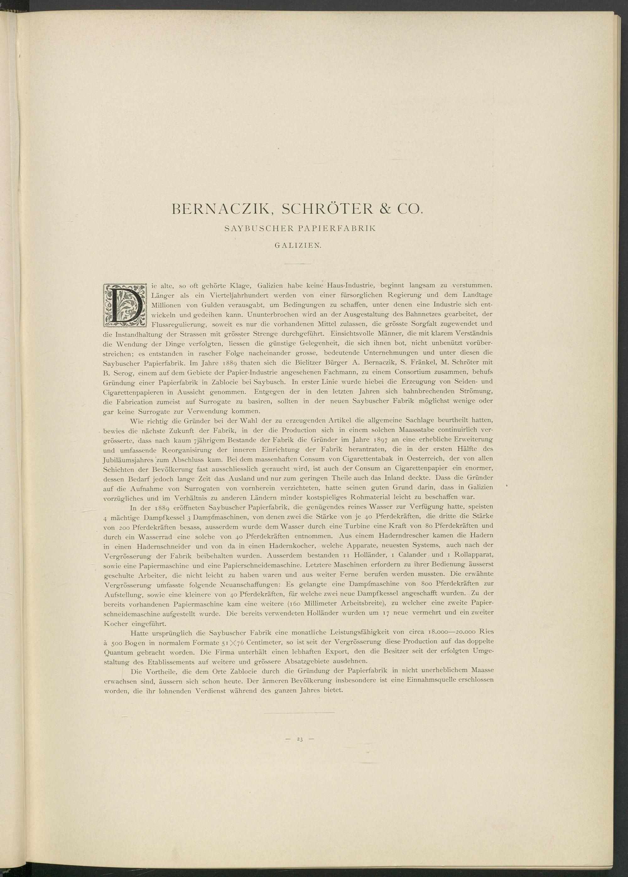 ie alte, so oft gehörte Klage, Galizien habe keine Haus-Industrie, beginnt langsam zu verstummen. Länger als ein Vierteljahrhundert werden von einer fürsorglichen Regierung und dem Landtage Millionen von Gulden verausgabt, um Bedingungen zu schaffen, unter denen eine Industrie sich entwickeln und gedeihen kann. Ununterbrochen wird an der Ausgestaltung des Bahnnetzes gearbeitet, der Flussregulierung, soweit es nur die vorhandenen Mittel zulassen, die grösste Sorgfalt zugewendet und die Instandhaltung der Strassen mit grösster Strenge durchgeführt. Einsichtsvolle Männer, die mit klarem Verständnis die Wendung der Dinge verfolgten, Hessen die günstige Gelegenheit, die sich ihnen bot, nicht unbenützt vorüberstreichen; es entstanden in rascher Folge nacheinander grosse, bedeutende Unternehmungen und unter diesen die Saybuscher Papierfabrik. Im Jahre 1889 thaten sich die Bielitzer Bürger A. Bernaczik, S. Fränkel, M. Schröter mit B. Serog, einem auf dem Gebiete der Papier-Industrie angesehenen Fachmann, zu einem Consortium zusammen, behufs Gründung einer Papierfabrik in Zablocie bei Saybusch. In erster Linie wurde hiebei die Erzeugung von Seiden- und Cigarettenpapieren in Aussicht genommen. Entgegen der in den letzten Jahren sich bahnbrechenden Strömung, die Fabrication zumeist auf Surrogate zu basiren, sollten in der neuen Saybuscher Fabrik möglichst wenige oder gar keine Surrogate zur Verwendung kommen.