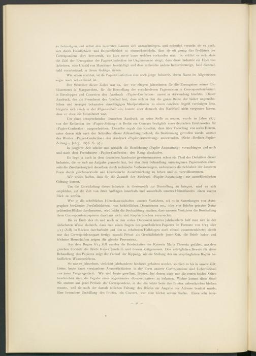 Der Schreiber dieser Zeilen war es, der vor einigen Jahrzehnten für die Erzeugnisse seines Eta­blissements in Margarethen, für die Herstellung der verschiedenen Papiersorten in Correspondenzformat, in Enveloppes und Cassetten den Ausdruck »Papier-Confection« zuerst in Anwendung brachte. Dieser Ausdruck, der als Fremdwort den Vortheil bot, dass sich in ihm die ganze Reihe der bisher ungewöhn­lichen und weniger bekannten einschlägigen Manipulationen zu einem concisen Begriff vereinigen liess, bürgerte sich rasch in der Allgemeinheit ein, konnte aber dennoch den Nachtheil nicht vergessen lassen, dass er eben ein Fremdwort war.