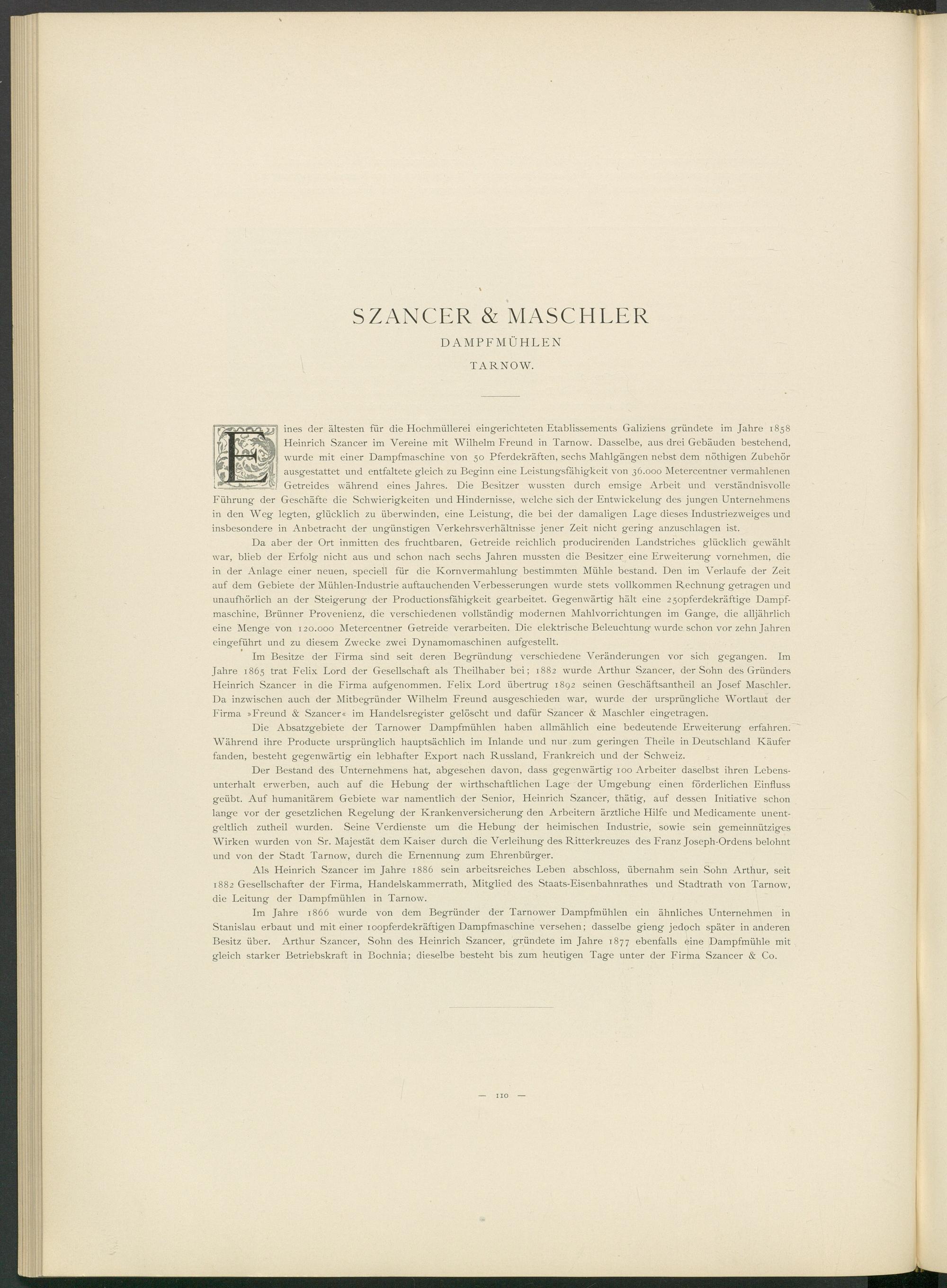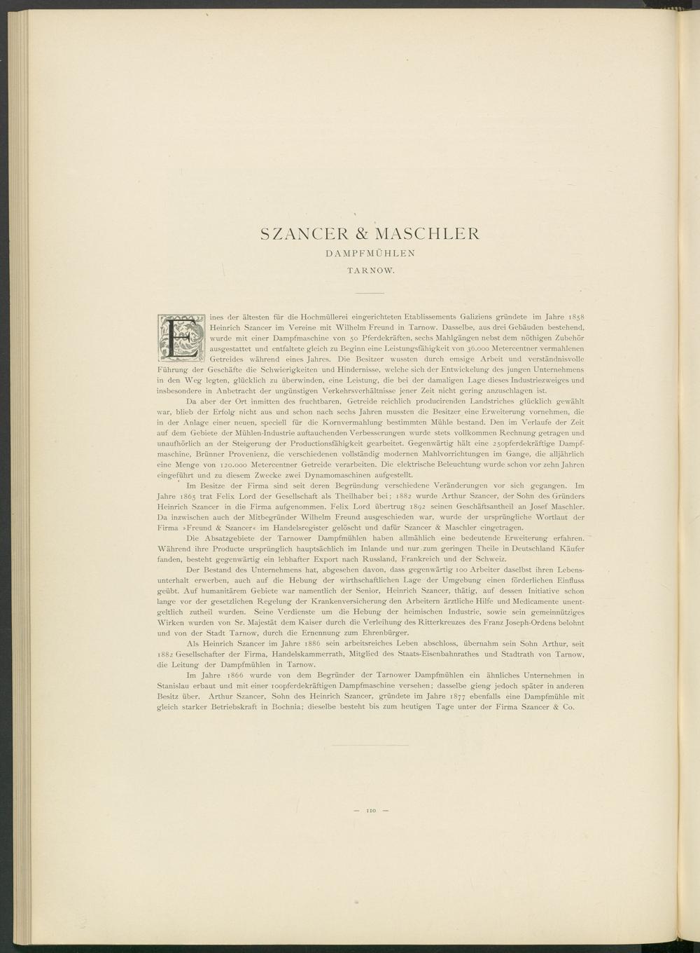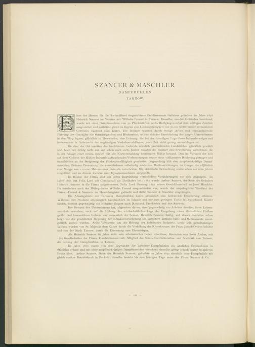 ines der ältesten für die Hochmüllerei eingerichteten Etablissements Galiziens gründete im Jahre 1858 Heinrich Szancer im Vereine mit Wilhelm Freund in Tarnow. Dasselbe, aus drei Gebäuden bestehend, wurde mit einer Dampfmaschine von 50 Pferdekräften, sechs Mahlgängen nebst dem nöthigen Zubehör ausgestattet und entfaltete gleich zu Beginn eine Leistungsfähigkeit von 36.000 Metercentner vermahlenen Getreides während eines Jahres. Die Besitzer wussten durch emsige Arbeit und verständnisvolle Führung der Geschäfte die Schwierigkeiten und Hindernisse, welche sich der Entwickelung des jungen Unternehmens in den Weg legten, glücklich zu überwinden, eine Leistung, die bei der damaligen Lage dieses Industriezweiges und insbesondere in Anbetracht der ungünstigen Verkehrsverhältnisse jener Zeit nicht gering anzuschlagen ist.