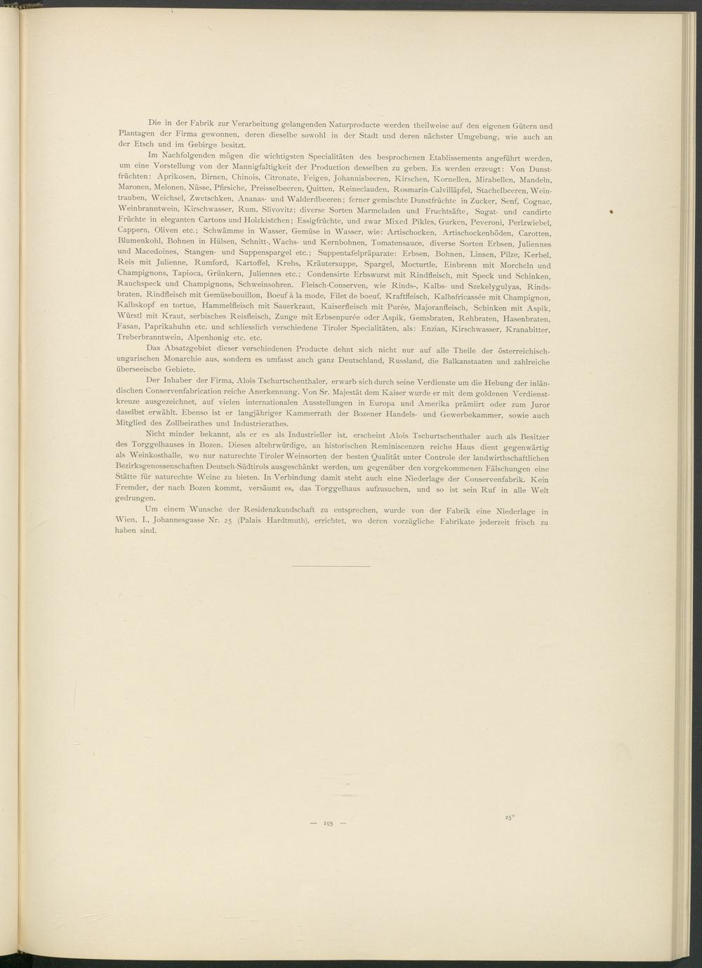 Der Inhaber der Firma, Alois Tschurtschenthaler, erwarb sich durch seine Verdienste um die Hebung der inlän­dischen Conservenfabrication reiche Anerkennung. Von Sr. Majestät dem Kaiser wurde er mit dem goldenen Verdienst­kreuze ausgezeichnet, auf vielen internationalen Ausstellungen in Europa und Amerika prämiirt oder zum Juror daselbst erwählt. Ebenso ist er langjähriger Kammerrath der Bozener Handels- und Gewerbekammer, sowie auch Mitglied des Zollbeirathes und Industrierathes.