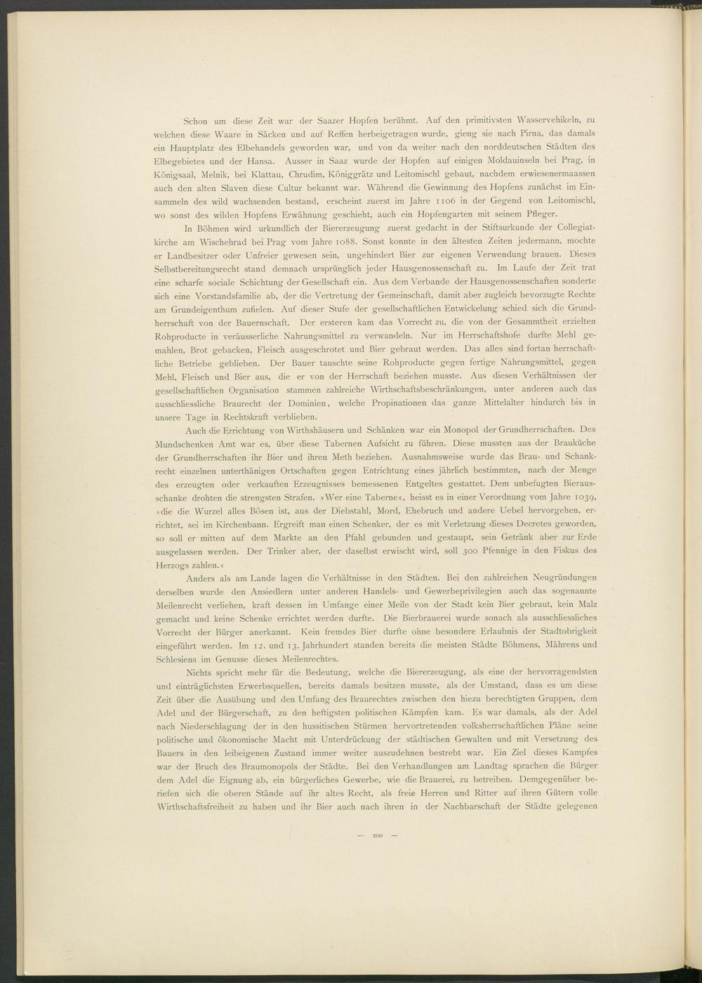 Schon um diese Zeit war der Saazer Hopfen berühmt. Auf den primitivsten Wasservehikeln, zu welchen diese Waare in Säcken und auf Reffen herbeigetragen wurde, gieng sie nach Pirna, das damals ein Hauptplatz des Elbehandels geworden war, und von da weiter nach den norddeutschen Städten des Elbegebietes und der Hansa. Ausser in Saaz wurde der Hopfen auf einigen Moldauinseln bei Prag, in Königsaal, Melnik, bei Klattau, Chrudim, Königgrätz und Leitomischl gebaut, nachdem erwiesenermaassen auch den alten Slaven diese Cultur bekannt war. Während die Gewinnung des Hopfens zunächst im Ein­sammeln des wild wachsenden bestand, erscheint zuerst im Jahre 1106 in der Gegend von Leitomischl, wo sonst des wilden Hopfens Erwähnung geschieht, auch ein Hopfengarten mit seinem Pfleger.