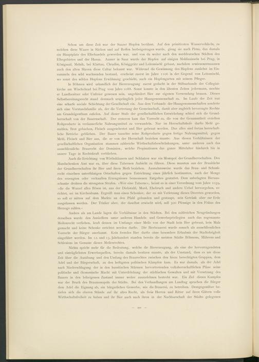 In Böhmen wird urkundlich der Biererzeugung zuerst gedacht in der Stiftsurkunde der Collegiat- kirche am Wischehrad bei Prag vom Jahre 1088. Sonst konnte in den ältesten Zeiten jedermann, mochte er Landbesitzer oder Unfreier gewesen sein, ungehindert Bier zur eigenen Verwendung brauen. Dieses Selbstbereitungsrecht stand demnach ursprünglich jeder Hausgenossenschaft zu. Im Laufe der Zeit trat eine scharfe sociale Schichtung der Gesellschaft ein. Aus dem Verbände der Hausgenossenschaften sonderte sich eine Vorstandsfamilie ab, der die Vertretung der Gemeinschaft, damit aber zugleich bevorzugte Rechte am Grundeigenthum zufielen. Auf dieser Stufe der gesellschaftlichen Entwickelung schied sich die Grund­herrschaft von der Bauernschaft. Der ersteren kam das Vorrecht zu, die von der Gesammtheit erzielten Rohproducte in veräusserliche Nahrungsmittel zu verwandeln. Nur im Herrschaftshofe durfte Mehl ge­mahlen, Brot gebacken, Fleisch ausgeschrotet und Bier gebraut werden. Das alles sind fortan herrschaft­liche Betriebe geblieben. Der Bauer tauschte seine Rohproducte gegen fertige Nahrungsmittel, gegen Mehl, Fleisch und Bier aus, die er von der Herrschaft beziehen musste. Aus diesen Verhältnissen der gesellschaftlichen Organisation stammen zahlreiche Wirthschaftsbeschränkungen, unter anderen auch das ausschliessliche Braurecht der Dominien, welche Propinationen das ganze Mittelalter hindurch bis in unsere Tage in Rechtskraft verblieben.