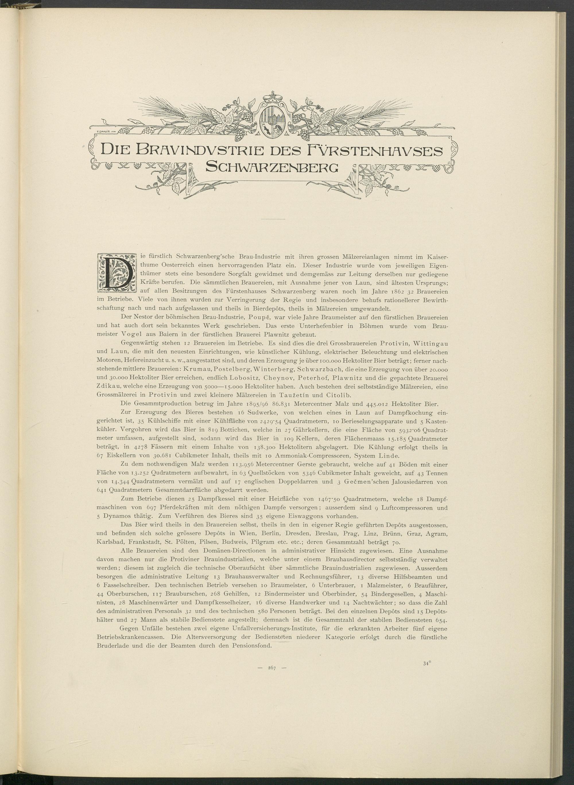 ie fürstlich Schwarzenberg’sche Brau-Industrie mit ihren grossen Mälzereianlagen nimmt im Ivaiser- thume Oesterreich einen hervorragenden Platz ein. Dieser Industrie wurde vom jeweiligen F.igen- thümer stets eine besondere Sorgfalt gewidmet und demgemäss zur Leitung derselben nur gediegene Kräfte berufen. Die sämmtlichen Brauereien, mit Ausnahme jener von Laun, sind ältesten Ursprungs; auf allen Besitzungen des Fürstenhauses Schwarzenberg waren noch im Jahre 1862 32 Brauereien im Betriebe. Viele von ihnen wurden zur Verringerung der Regie und insbesondere behufs rationellerer Bewirth- schaftung nach und nach aufgelassen und theils in Bierdepôts, theils in Mälzereien umgewandelt.