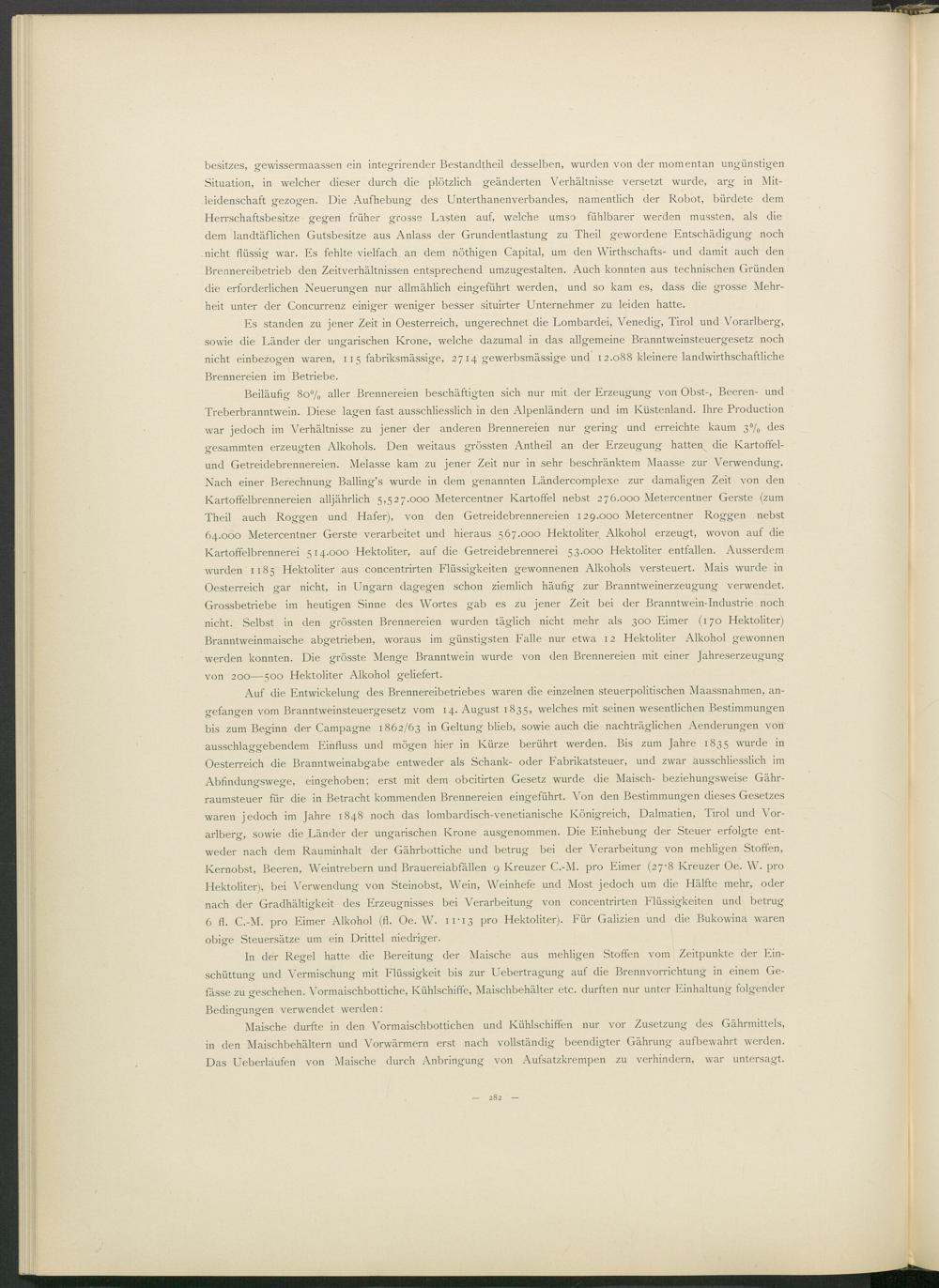 Beiläufig 80% aller Brennereien beschäftigten sich nur mit der Erzeugung von Obst-, Beeren- und Treberbranntwein. Diese lagen fast ausschliesslich in den Alpenländern und im Küstenland. Ihre Production war jedoch im Verhältnisse zu jener der anderen Brennereien nur gering und erreichte kaum 3% des gesammten erzeugten Alkohols. Den weitaus grössten Anteil an der Erzeugung hatten die Ivartoffel- und Getreidebrennereien. Melasse kam zu jener Zeit nur in sehr beschränktem Maasse zur Verwendung. Nach einer Berechnung Balling’s wurde in dem genannten Ländercomplexe zur damaligen Zeit von den Kartoffelbrennereien alljährlich 5,527.000 Metercentner Kartoffel nebst 276.000 Metercentner Gerste (zum Theil auch Roggen und Hafer), von den Getreidebrennereien 129.000 Metercentner Roggen nebst 64.000 Metercentner Gerste verarbeitet und hieraus 567.000 Hektoliter Alkohol erzeugt, wovon auf die Kartoffelbrennerei 514.000 Hektoliter, auf die Getreidebrennerei 53.000 Hektoliter entfallen. Ausserdem wurden 1185 Hektoliter aus concentrirten Flüssigkeiten gewonnenen Alkohols versteuert. Mais wurde in Oesterreich gar nicht, in Ungarn dagegen schon ziemlich häufig zur Branntweinerzeugung verwendet. Grossbetriebe im heutigen Sinne des Wortes gab es zu jener Zeit bei der Branntwein-Industrie noch nicht. Selbst in den grössten Brennereien wurden täglich nicht mehr als 300 Eimer (170 Hektoliter) Branntweinmaische abgetrieben, woraus im günstigsten Falle nur etwa 12 Hektoliter Alkohol gewonnen werden konnten. Die grösste Menge Branntwein wurde von den Brennereien mit einer Jahreserzeugung von 200—500 Hektoliter Alkohol geliefert.
