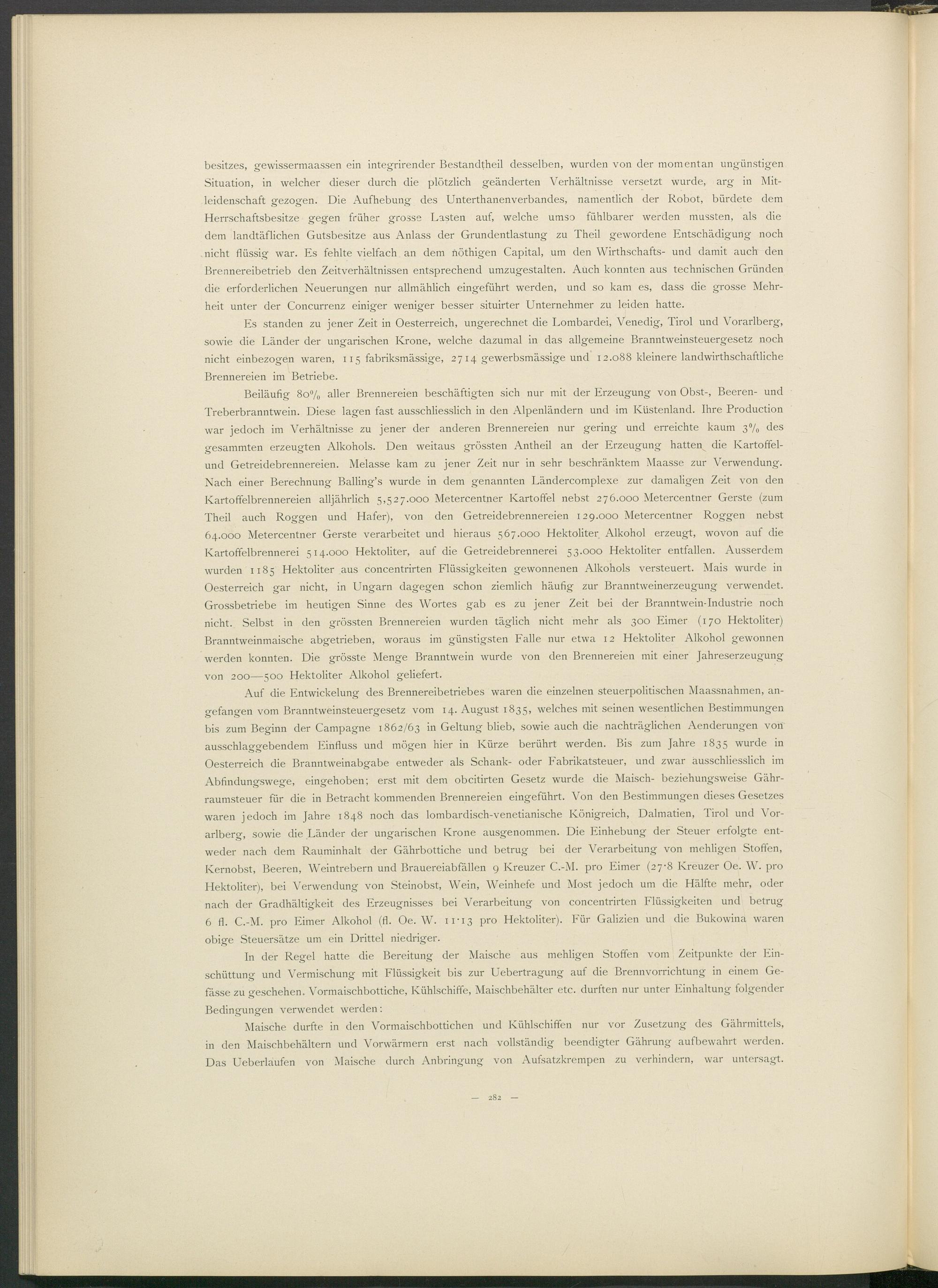Auf die Entwickelung des Brennereibetriebes waren die einzelnen steuerpolitischen Maassnahmen, angefangen vom Branntweinsteuergesetz vom 14. August 1835, welches mit seinen wesentlichen Bestimmungen bis zum Beginn der Campagne 1862/63 in Geltung blieb, sowie auch die nachträglichen Aenderungen von ausschlaggebendem Einfluss und mögen hier in Kürze berührt werden. Bis zum Jahre 1835 wurde in Oesterreich die Branntweinabgabe entweder als Schank- oder Fabrikatsteuer, und zwar ausschliesslich im Abfindungswege, eingehoben; erst mit dem obcitirten Gesetz wmrde die Maisch- beziehungsweise Gähr- raumsteuer für die in Betracht kommenden Brennereien eingeführt. Von den Bestimmungen dieses Gesetzes waren jedoch im Jahre 1848 noch das lombardisch-venetianische Königreich, Dalmatien, Tirol und Vorarlberg, sowie die Länder der ungarischen Krone ausgenommen. Die Einhebung der Steuer erfolgte entweder nach dem Rauminhalt der Gährbottiche und betrug bei der Verarbeitung von mehligen Stoffen, Kernobst, Beeren, Weintrebern und Brauereiabfällen 9 Kreuzer C.-M. pro Eimer (27-8 Kreuzer Oe. W. pro Hektoliter), bei Verwendung von Steinobst, Wein, Weinhefe und Most jedoch um die Hälfte mehr, oder nach der Gradhältigkeit des Erzeugnisses bei Verarbeitung von concentrirten Flüssigkeiten und betrug 6 fl. C.-M. pro Eimer Alkohol (fl. Oe. W. 11-13 pro Hektoliter). Für Galizien und die Bukowina waren obige Steuersätze um ein Drittel niedriger.
