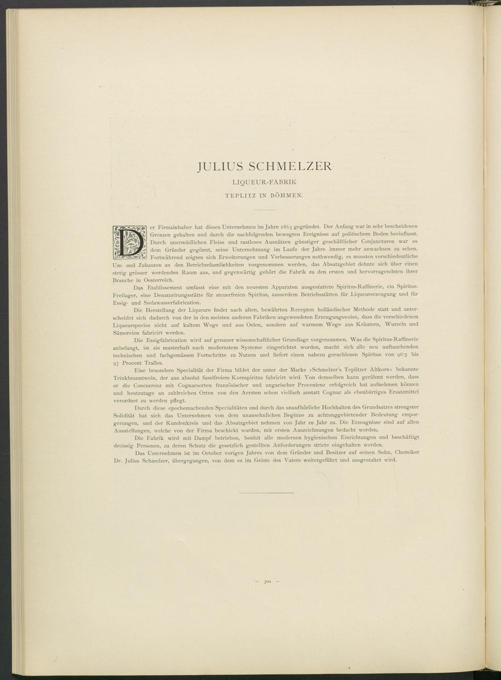 Eine besondere Specialität der Firma bildet der unter der Marke »Schmelzer’s Teplitzer Altkorn« bekannte Trinkbranntwein, der aus absolut fuselfreiem Kornspiritus fabricirt wird. Von demselben kann gerühmt werden, dass er die Concurrenz mit Cognacsorten französischer und ungarischer Provenienz erfolgreich hat aufnehmen können und heutzutage an zahlreichen Orten von den Aerzten schon vielfach anstatt Cognac als ebenbürtiges Ersatzmittel verordnet zu werden pflegt.