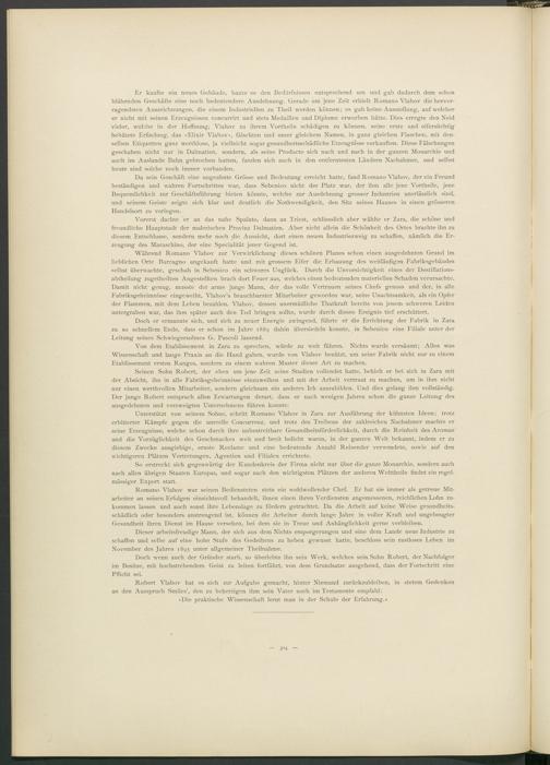 Er kaufte ein neues Gebäude, baute es den Bedürfnissen entsprechend um und gab dadurch dem schon blühenden Geschäfte eine noch bedeutendere Ausdehnung. Gerade um jene Zeit erhielt Romano Vlahov die hervorragendsten Auszeichnungen, die einem Industriellen zu Theil werden können; es gab keine Ausstellung, auf welcher er nicht mit seinen Erzeugnissen concurrirt und stets Medaillen und Diplome erworben hätte. Dies erregte den Neid vieler, welche in der Hoffnung, Vlahov zu ihrem Vortheile schädigen zu können, seine erste und eifersüchtig behütete Erfindung, das »Elixir Vlahov«, fälschten und unter gleichem Namen, in ganz gleichen Flaschen, mit denselben Etiquetten ganz werthlose, ja vielleicht sogar gesundheitsschädliche Erzeugnisse verkauften. Diese Fälschungen geschahen nicht nur in Dalmatien, sondern, als seine Producte sich nach und nach in der ganzen Monarchie und auch im Auslande Bahn gebrochen hatten, fanden sich auch in den entferntesten Ländern Nachahmer, und selbst heute sind solche noch immer vorhanden.