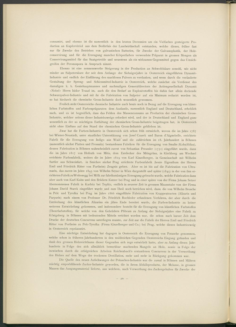 Zwar hat die Farben-Industrie in Oesterreich sich schon früh entwickelt, wovon die im Jahre 1787 bei Wiener-Neustadt, unter staatlicher Unterstützung von Josef Czasek und Baron d’Aignebelle, errichtete Fabrik für die Erzeugung von Indigo aus Waid und die zahlreichen im 18. Jahrhundert in Böhmen (namentlich nächst Platten und Pressnitz) bestandenen Fabriken für die Erzeugung von Smalte (Kobaltblau), dessen Fabrication in Böhmen wahrscheinlich zuerst von Sebastian Preussler (1751) eingeführt wurde, dann die im Jahre 1817 von Hofrath von Mitis, dem Entdecker des Mitisgrüns, in Kirchberg am Wechsel errichtete Farbenfabrik, weiters die im Jahre 1819 von Karl Kinzelberger, in Gemeinschaft mit Wilhelm Sattler aus Schweinfurt, in Smichov nächst Prag errichtete Farbenfabrik (heute Eigenthum der Herren Emil und Friedrich Ritter von Portheim) Zeugnis geben. Aber es ist bis auf die Fabrication von Ultramarin, das zuerst im Jahre 1843 von Wilhelm Setzer in Wien dargestellt und später (1845) in der von ihm errichteten Fabrik zu Weitenegg bei Mölk zur fabriksmässigen Erzeugung gebracht wurde, welche Fabrication dann aber auch von Karl Kuhn und den Brüdern Kutzer bei Prag und in einer später von der Firma Johann Setzer übernommenen Fabrik in Karbitz bei Teplitz, endlich in neuerer Zeit in grossem Maassstabe von der Firma Johann David Starck eingeführt wurde und zum Theil noch betrieben wird, dann die von Wilhelm Brosche in Pelc und Tyrolka bei Prag im Jahre 1866 eingeführte Fabrication von Krappextracten (Alizarin und Purpurin) nach einem von Professor Dr. Friedrich Rochleder erfundenen Verfahren, der aber durch die Entdeckung des künstlichen Alizarins ein jähes Ende bereitet wurde, die Farben-Industrie zu keiner weiteren Entwickelung gekommen, und insbesondere besteht für die Erzeugung von künstlichen Farbstoffen (Theerfarbstoffen), für welche von den Gebrüdern Pribram zu Anfang der Siebzigerjahre eine Fabrik zu Königsberg in Böhmen mit bedeutenden Mitteln errichtet worden war, die schon nach kurzer Zeit dem Drucke der deutschen Concurrenz unterliegen musste, zur Zeit nur die Fabrik der Herren Emil und Friedrich Ritter von Portheim zu Pelc-Tyrolka (Firma Kinzelberger und Co.) bei Prag, welche diesen Industriezweig in Oesterreich repräsentirt.