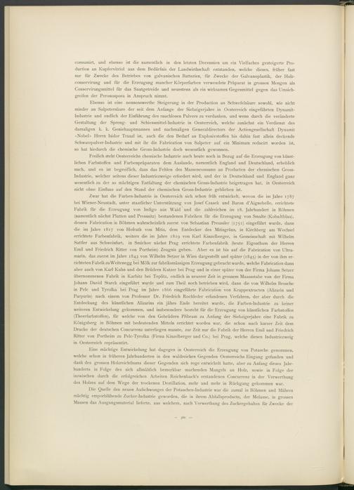 Ebenso ist eine nennenswerthe Steigerung in der Production an Schwefelsäure sowohl, wie nicht minder an Salpetersäure der seit dem Anfänge der Siebzigerjahre in Oesterreich eingeführten Dynamit- Industrie und endlich der Einführung des rauchlosen Pulvers zu verdanken, und wenn durch die veränderte Gestaltung der Spreng- und Schiessmittel-Industrie in Oesterreich, welche zunächst ein Verdienst des damaligen k. k. Geniehauptmannes und nachmaligen Generaldirectors der Actiengesellschaft Dynamit »Nobel« Herrn Isidor Trauzl ist, auch die den Bedarf an Explosivstoffen bis dahin fast allein deckende Schwarzpulver-Industrie und mit ihr die Fabrication von Salpeter auf ein Minimum reducirt worden ist, so hat hiedurch die chemische Gross-Industrie doch wesentlich gewonnen.