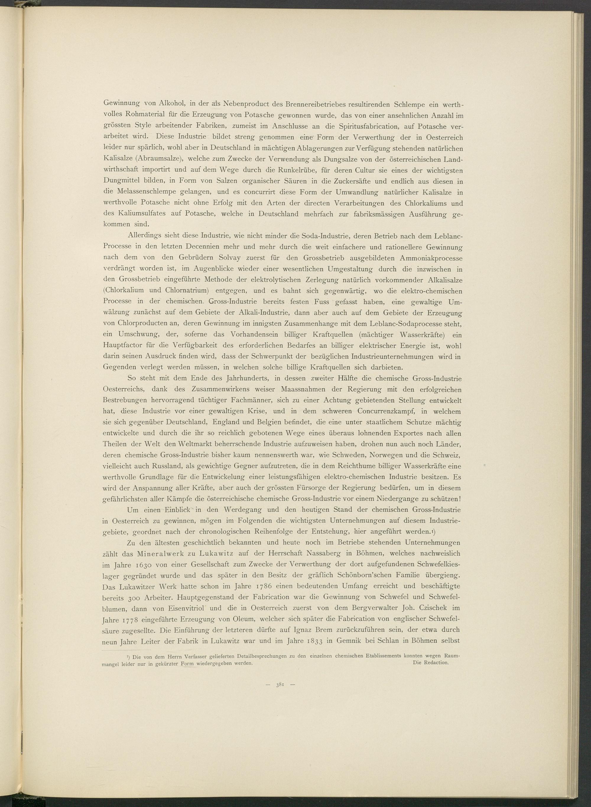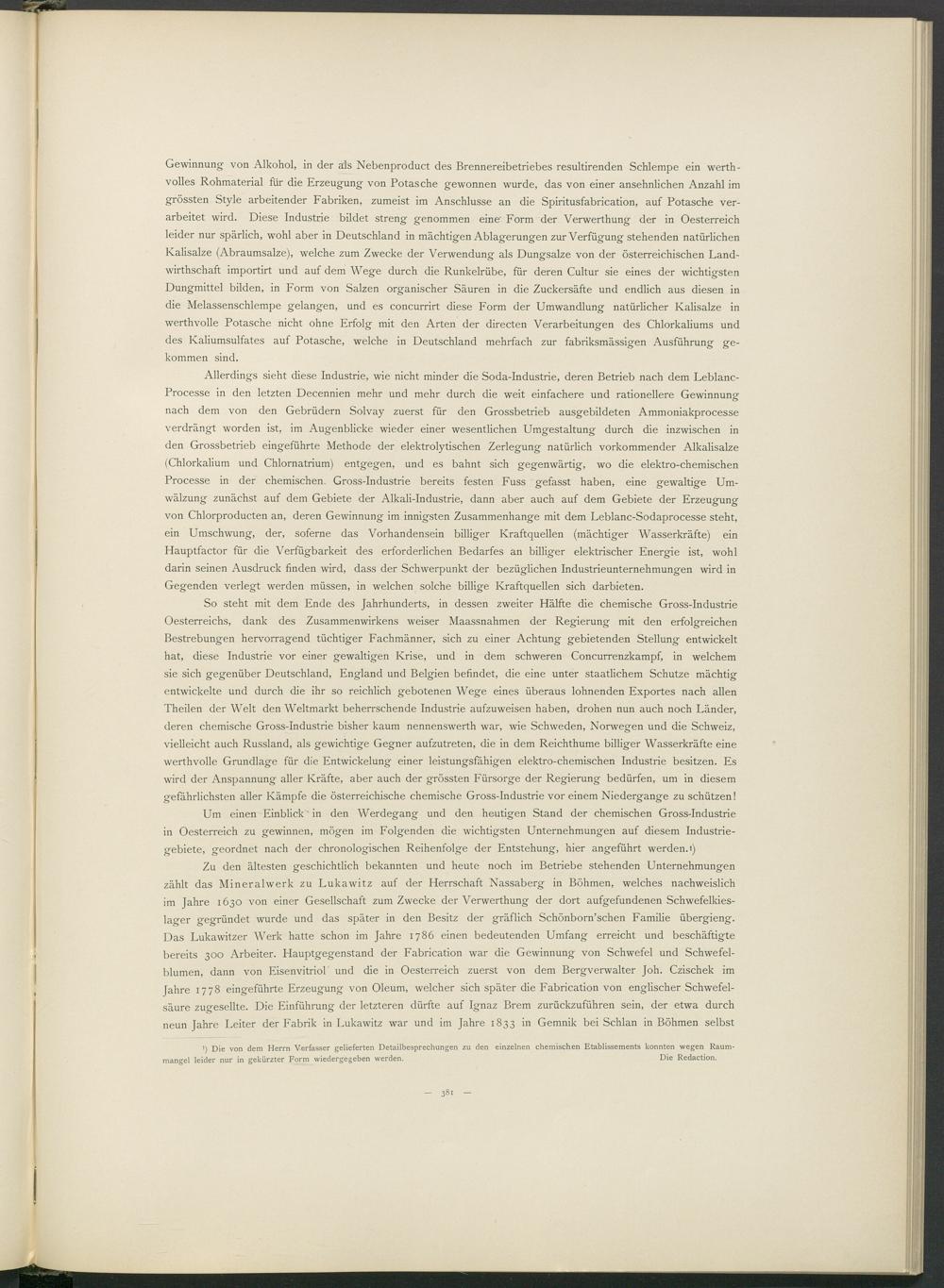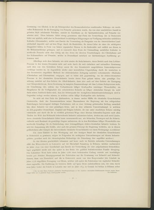 Um einen Einblick ' in den Werdegang und den heutigen Stand der chemischen Gross-Industrie in Oesterreich zu gewinnen, mögen im Folgenden die wichtigsten Unternehmungen auf diesem Industriegebiete, geordnet nach der chronologischen Reihenfolge der Entstehung, hier angeführt werden.»)