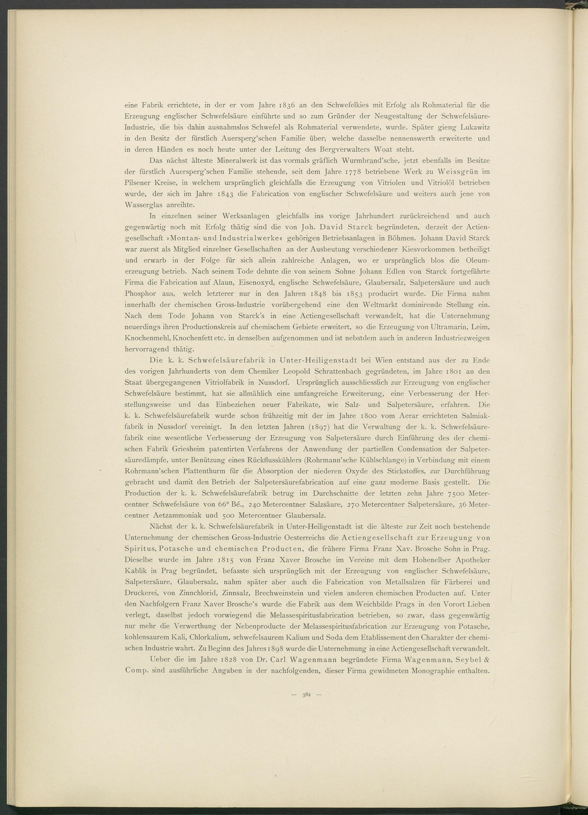 In einzelnen seiner Werksanlagen gleichfalls ins vorige Jahrhundert zurückreichend und auch gegenwärtig noch mit Erfolg thätig sind die von Joh. David Starck begründeten, derzeit der Actien- gesellschaft »Montan- und Industrialwerke« gehörigen Betriebsanlagen in Böhmen. Johann David Starck war zuerst als Mitglied einzelner Gesellschaften an der Ausbeutung verschiedener Kiesvorkommen betheiligt und erwarb in der Folge für sich allein zahlreiche Anlagen, wo er ursprünglich blos die Oleumerzeugung betrieb. Nach seinem Tode dehnte die von seinem Sohne Johann Edlen von Starck fortgeführte Firma die Fabrication auf Alaun, Eisenoxyd, englische Schwefelsäure, Glaubersalz, Salpetersäure und auch Phosphor aus, welch letzterer nur in den Jahren 1848 bis 1853 producirt wurde. Die Firma nahm innerhalb der chemischen Gross-Industrie vorübergehend eine den Weltmarkt dominirende Stellung ein. Nach dem Tode Johann von Starck’s in eine Actiengesellschaft verwandelt, hat die Unternehmung neuerdings ihren Productionskreis auf chemischem Gebiete erweitert, so die Erzeugung von Ultramarin, Leim, Knochenmehl, Knochenfett etc. in denselben aufgenommen und ist nebstdem auch in anderen Industriezweigen hervorragend thätig.