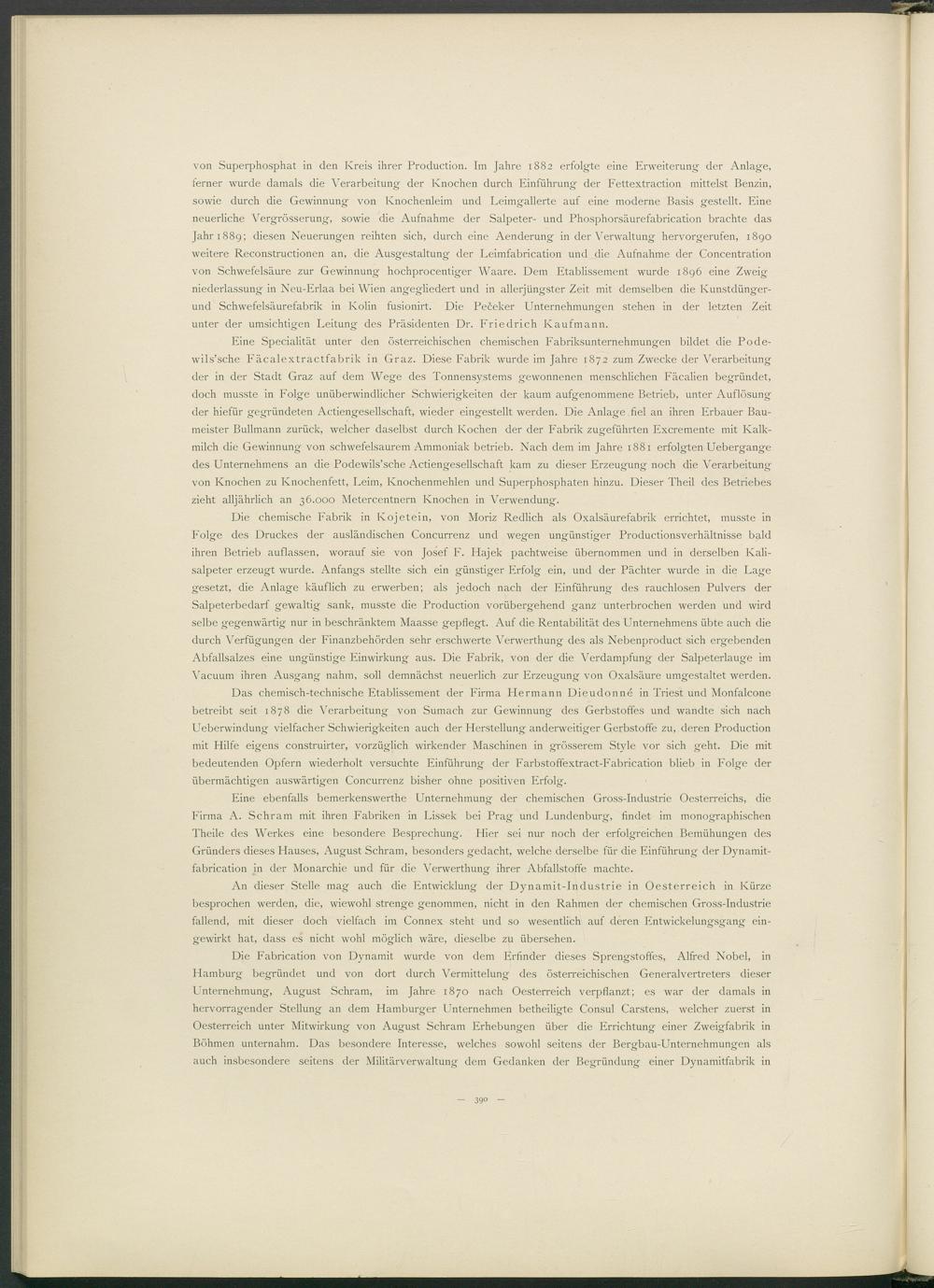 Eine ebenfalls bemerkenswerthe Unternehmung der chemischen Gross-Industrie Oesterreichs, die Firma A. Schram mit ihren Fabriken in Lissek bei Prag und Lundenburg, findet im monographischen Theile des Werkes eine besondere Besprechung. Hier sei nur noch der erfolgreichen Bemühungen des Gründers dieses Hauses, August Schram, besonders gedacht, welche derselbe für die Einführung der Dynamit- fabrication in der Monarchie und für die Verwerthung ihrer Abfallstoffe machte.