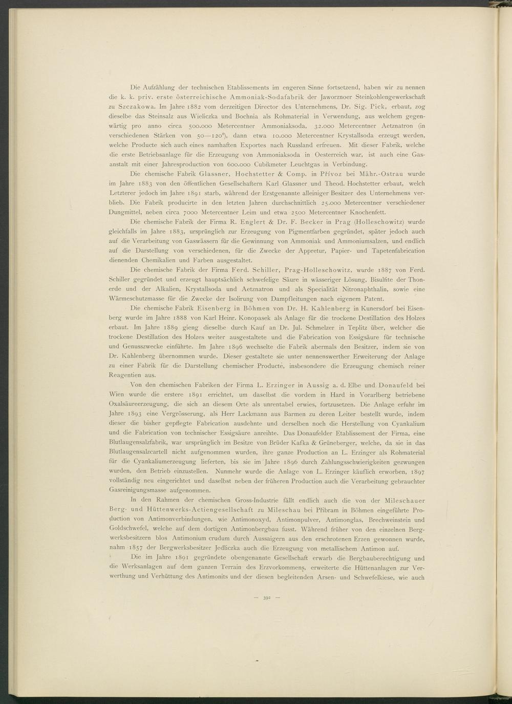 Von den chemischen Fabriken der Firma L. Erzinger in Aussig a. d. Elbe und Donaufeld bei Wien wurde die erstere 1891 errichtet, um daselbst die vordem in Hard in Vorarlberg betriebene Oxalsäureerzeugung, die sich an diesem Orte als unrentabel erwies, fortzusetzen. Die Anlage erfuhr im Jahre 1893 eine Vergrösserung, als Herr Lackmann aus Barmen zu deren Leiter bestellt wurde, indem dieser die bisher gepflegte Fabrication ausdehnte und derselben noch die Herstellung von Cyankalium und die Fabrication von technischer Essigsäure anreihte. Das Donaufelder Etablissement der Firma, eine Blutlaugensalzfabrik, war ursprünglich im Besitze von Brüder Kafka & Grüneberger, welche, da sie in das Blutlaugensalzcartell nicht aufgenommen wurden, ihre ganze Production an L. Erzinger als Rohmaterial für die Cyankaliumerzeugung lieferten, bis sie im Jahre 1896 durch Zahlungsschwierigkeiten gezwungen wurden, den Betrieb einzustellen. Nunmehr wurde die Anlage von L. Erzinger käuflich erworben, 1897 vollständig neu eingerichtet und daselbst neben der früheren Production auch die Verarbeitung gebrauchter Gasreinigungsmasse aufgenommen.