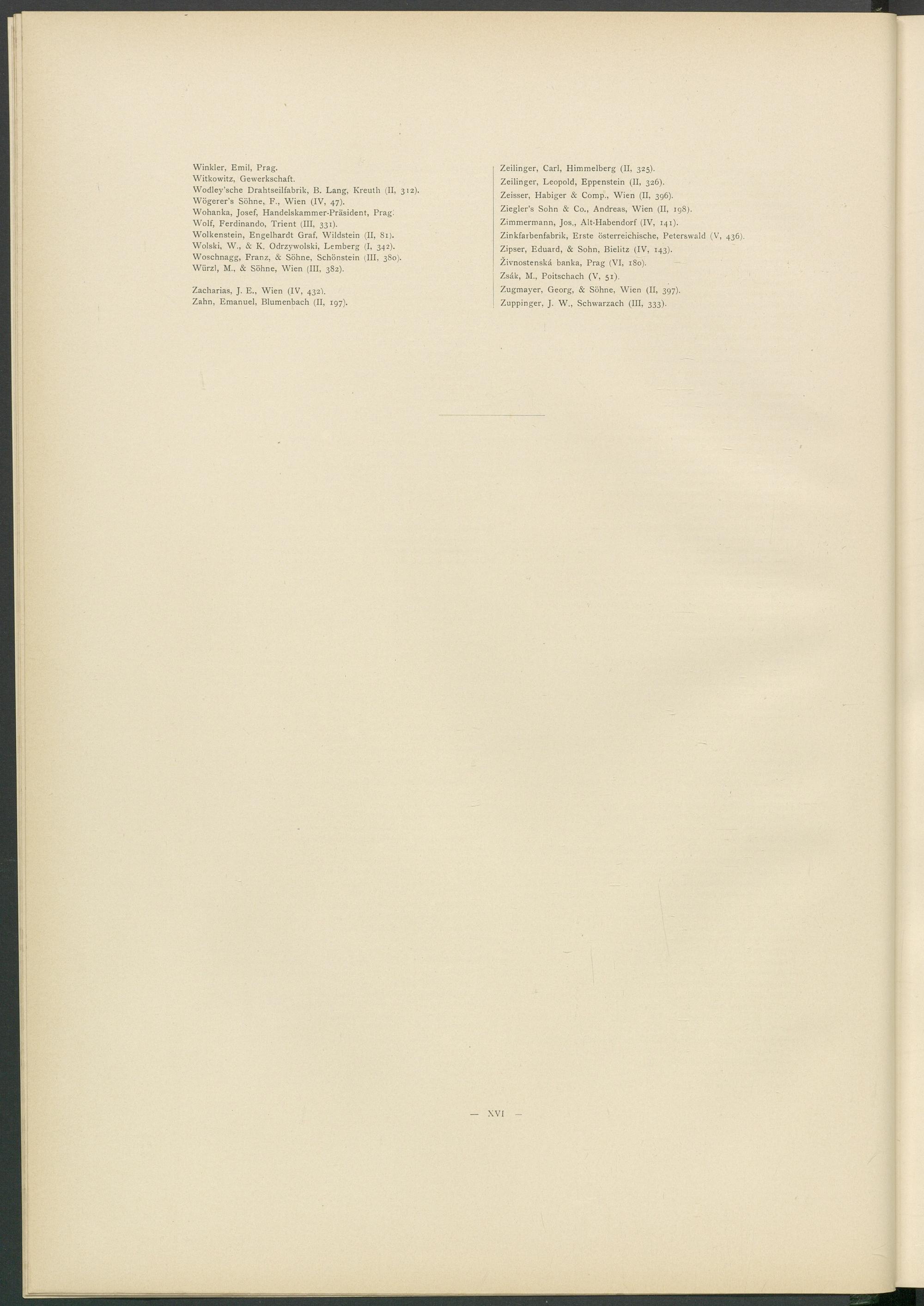 Wolkenstein, Engelhardt Graf, Wildstein (II, 81). Wolski, W., & K. Odrzywolski, Lemberg (I, 342). Woschnagg, Franz, & Söhne, Schönstein (III, 380). Würz!, M., & Söhne, Wien (III, 382).