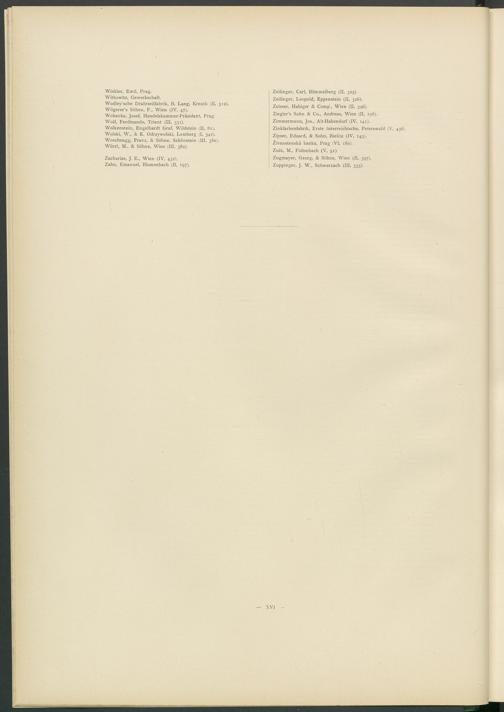 Ziegler’s Sohn & Co., Andreas, Wien (II, 198). Zimmermann, Jos., Alt-Habendorf (IV, 14 1 ). Zinkfarbenfabrik, Erste österreichische, Peterswald (V’, 436) Zipser, Eduard, & Sohn, Bielitz (IV, 143).