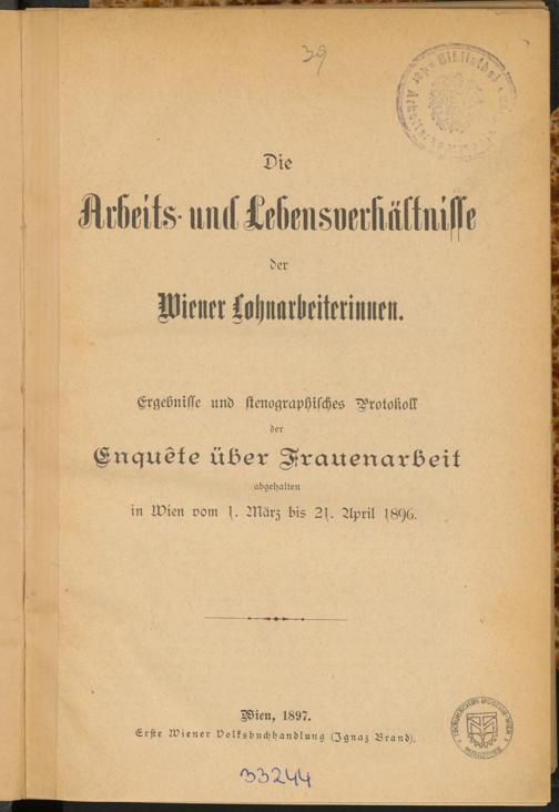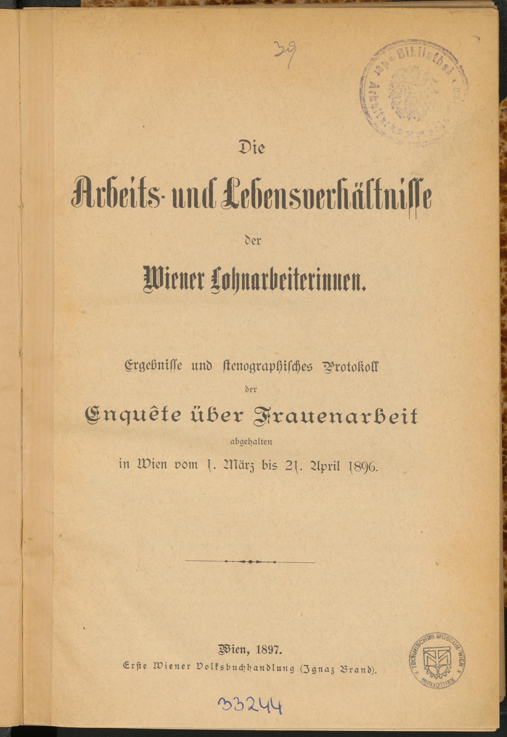 Die Arbeits- und Lebensverhältnisse der Wiener Lohnarbeiterinnen : Ergebnisse und stenographisches Protokoll der Enquete über Frauenarbeit, abgehalten in Wien vom 1. März bis 21. April 1896