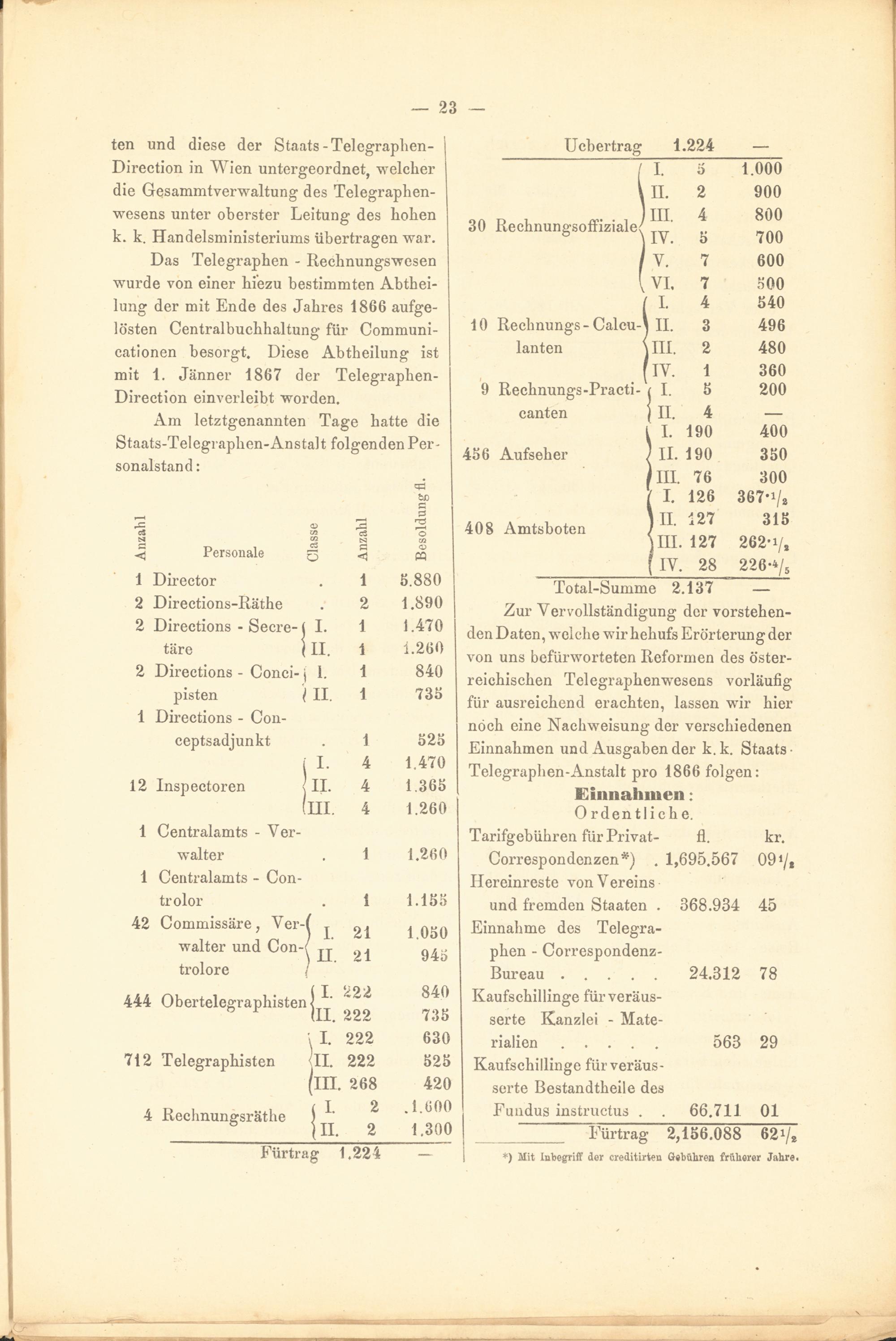 Am letztgenannten Tage hatte die Staats-Telegraphen-Anstalt folgenden Per- sonalstand: