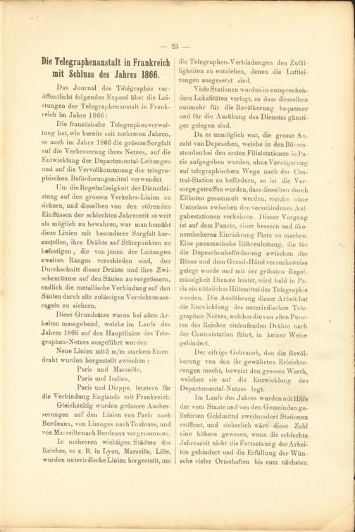 Die französische Telegraphenverwaltung hat, wie bereits seit mehreren Jahren, so auch im Jahre 1866 die grösste Sorgfalt auf die Verbesserung ihres Netzes, auf die Entwicklung der Departemental-Leitungen und auf die Vervollkommnung der telegraphischen Beförderungsmittel verwendet.