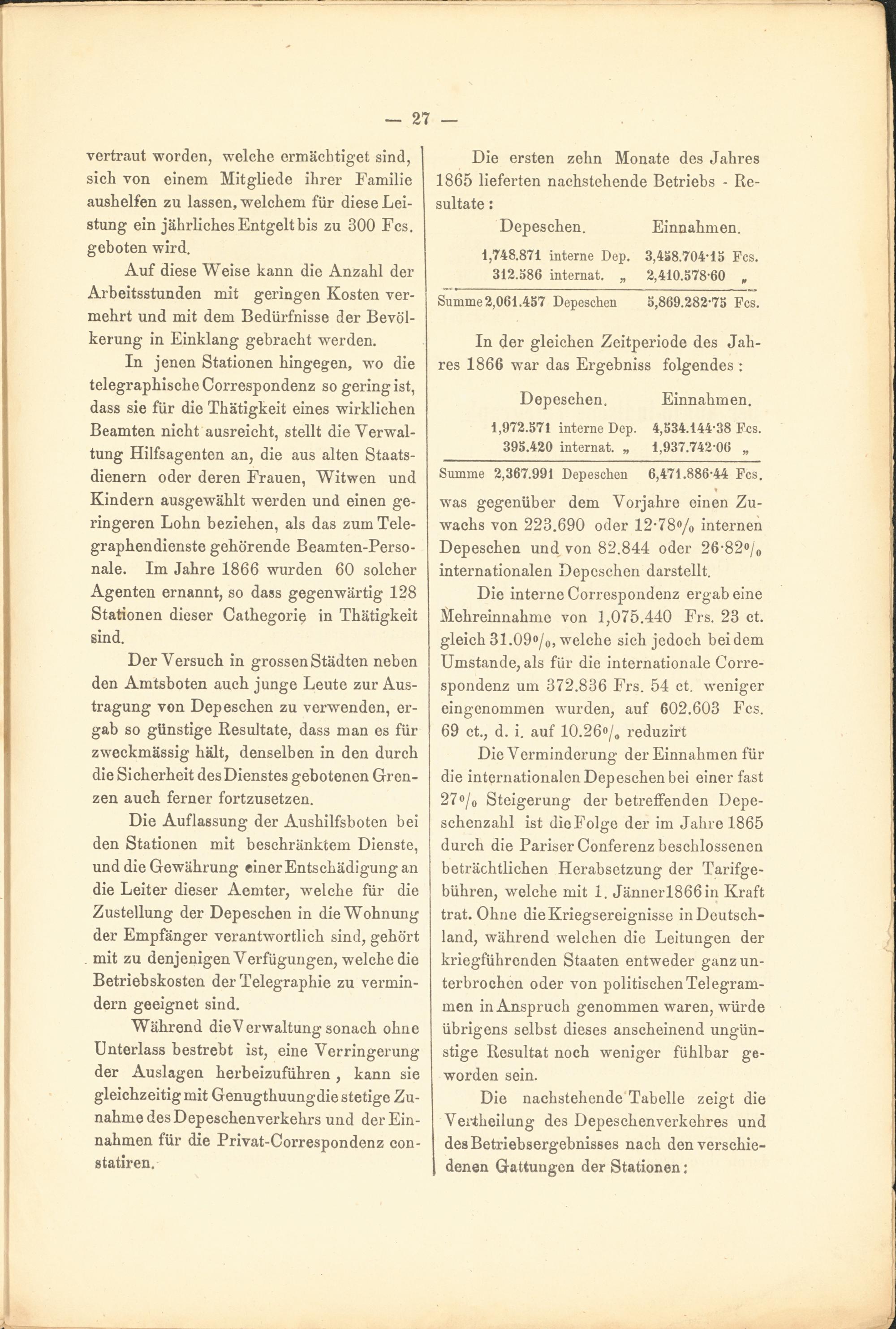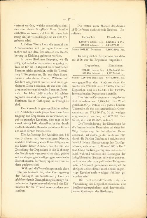 In jenen Stationen hingegen, wo die telegraphische Correspondenz so gering ist, dass sie für die Thätigkeit eines wirklichen Beamten nicht ausreicht, stellt die Verwaltung Hilfsagenten an, die aus alten Staatsdienern oder deren Frauen, Witwen und Kindern ausgewählt werden und einen geringeren Lohn beziehen, als das zum Telegraphendienste gehörende Beamten-Perso- nale. Im Jahre 1866 wurden 60 solcher Agenten ernannt, so dass gegenwärtig 128 Stationen dieser Cathegorie in Thätigkeit sind.