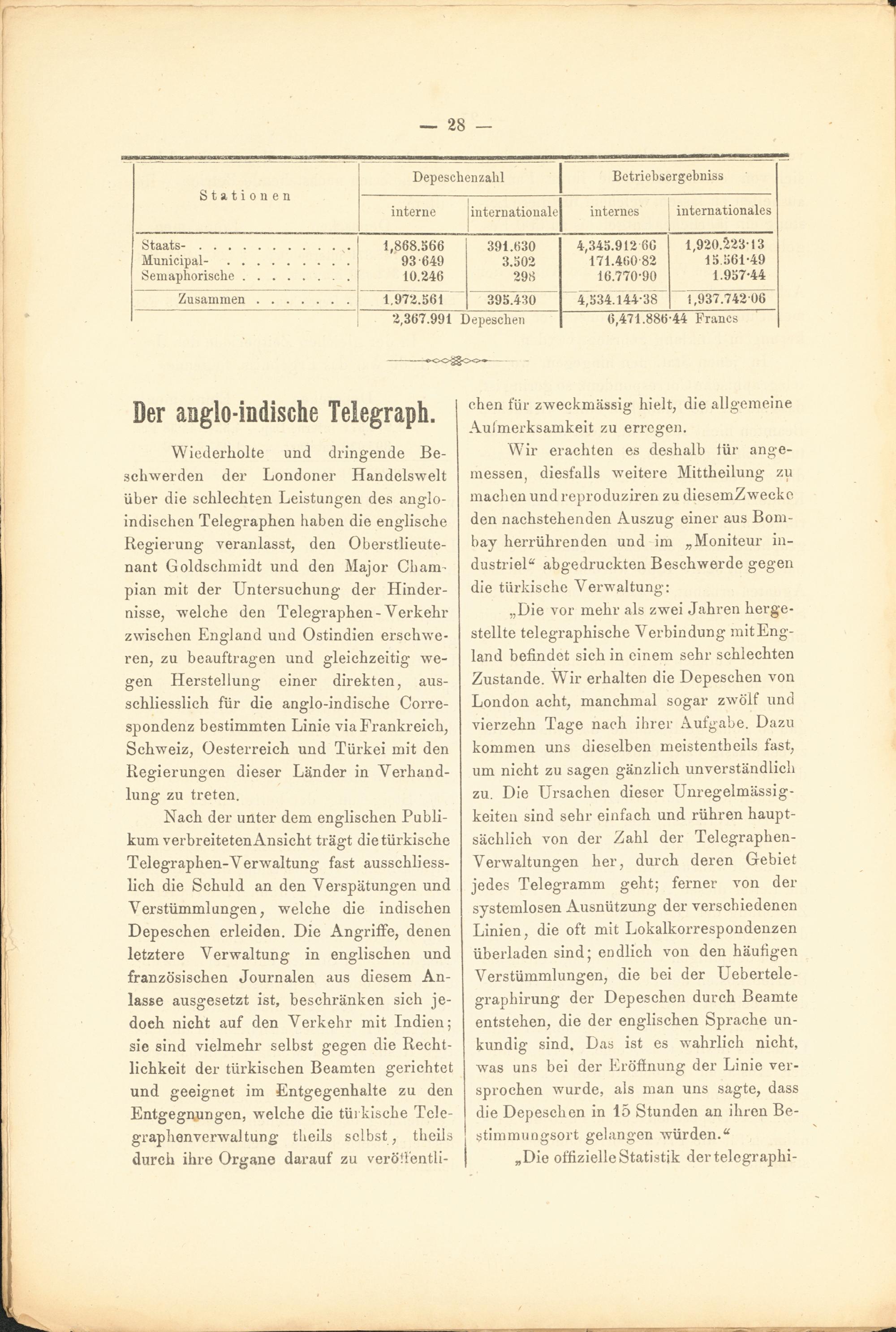 „Die vor mehr als zwei Jahren hergestellte telegraphische Verbindung mitEng- land befindet sich in einem sehr schlechten Zustande. Wir erhalten die Depeschen von London acht, manchmal sogar zwölf und vierzehn Tage nach ihrer Aufgabe. Dazu kommen uns dieselben meistentbeils fast, um nicht zu sagen gänzlich unverständlich zu. Die Ursachen dieser Unregelmässigkeiten sind sehr einfach und rühren hauptsächlich von der Zahl der Telegraphen- Verwaltungen her, durch deren Gebiet jedes Telegramm geht; ferner von der systemlosen Ausnützung der verschiedenen Linien, die oft mit Lokalkorrespondenzen überladen sind; endlich von den häufigen Verstümmlungen, die bei der Uebertele- graphirung der Depeschen durch Beamte entstehen, die der englischen Sprache unkundig sind. Das ist es wahrlich nicht, was uns bei der Eröffnung der Linie versprochen wurde, als man uns sagte, dass die Depeschen in 15 Stunden an ihren Bestimmungsort gelangen würden . u