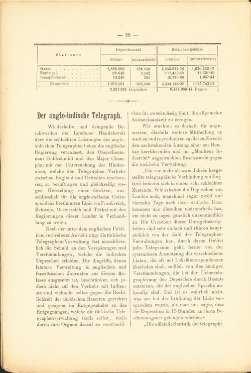 Nach der unter dem englischen Publikum verbreitetenAnsicht trägt die türkische Telegraphen-Verwaltung fast ausschliesslich die Schuld an den Verspätungen und Verstümmlungen, welche die indischen Depeschen erleiden. Die Angriffe, denen letztere Verwaltung in englischen und französischen Journalen aus diesem Anlasse ausgesetzt ist, beschränken sich jedoch nicht auf den Verkehr mit Indien; sie sind vielmehr selbst gegen die Rechtlichkeit der türkischen Beamten gerichtet und geeignet im Entgegenhalte zu den Entgegnungen, welche die türkische Telegraphenverwaltung theils selbst, theils durch ihre Organe darauf zu veröffentli