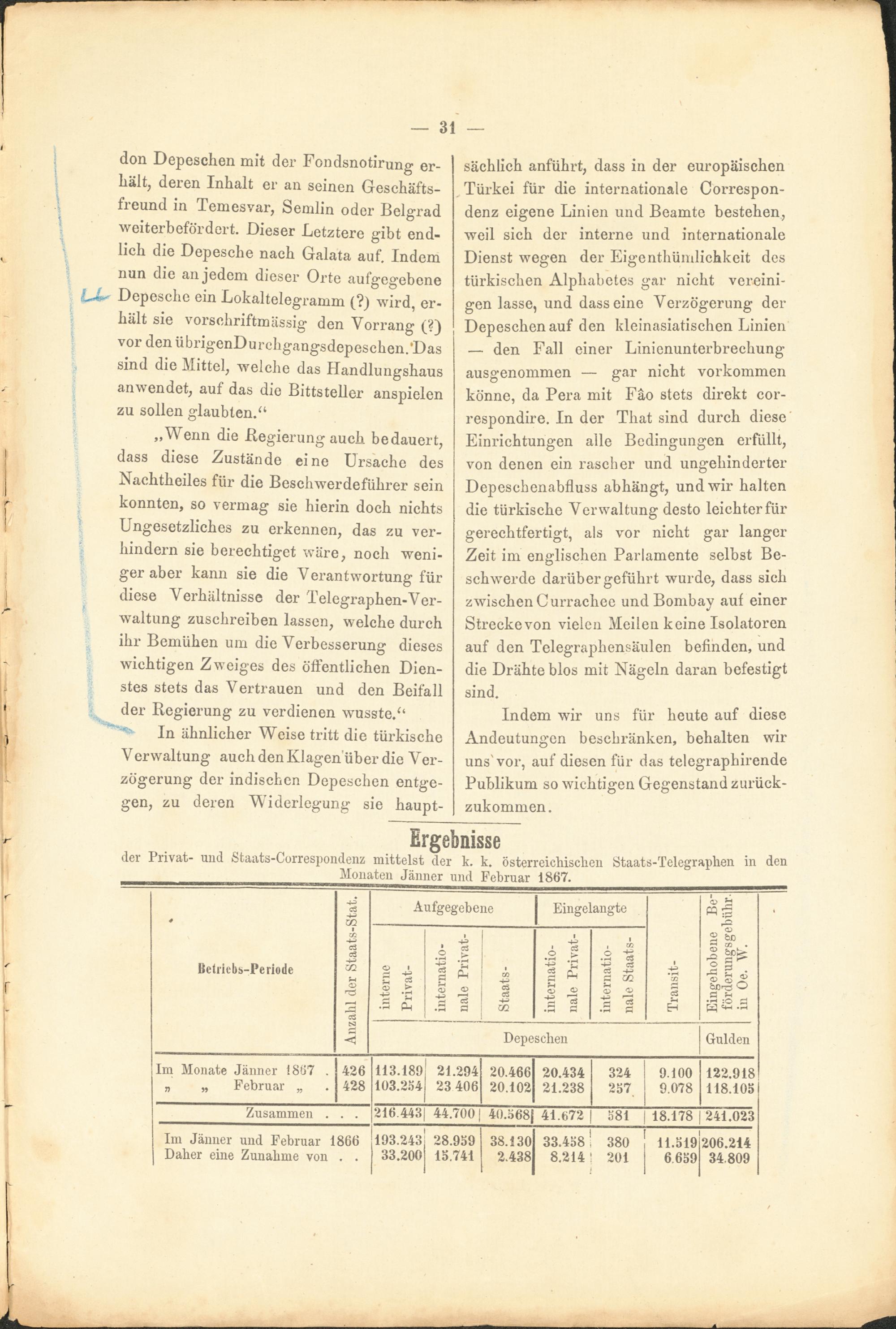sächlich anführt, dass in der europäischen Türkei für die internationale Correspon- denz eigene Linien und Beamte bestehen, weil sich der interne und internationale Dienst wegen der Eigenthümlichkcit des türkischen Alphabetes gar nicht vereinigen lasse, und dass eine Verzögerung der Depeschen auf den kleinasiatischen Linien — den Fall einer Linienunterbrechung ausgenommen — gar nicht Vorkommen könne, da Pera mit Fäo stets direkt cor- respondire. In der That sind durch diese Einrichtungen alle Bedingungen erfüllt, von denen ein rascher und ungehinderter Depeschenabfluss abhängt, und wir halten die türkische Verwaltung desto leichter für gerechtfertigt, als vor nicht gar langer Zeit im englischen Parlamente selbst Beschwerde darüber geführt wurde, dass sich zwischen Currachee und Bombay auf einer Streckevon vielen Meilen keine Isolatoren auf den Telegraphensäulen befinden, und die Drähte blos mit Nägeln daran befestigt sind.