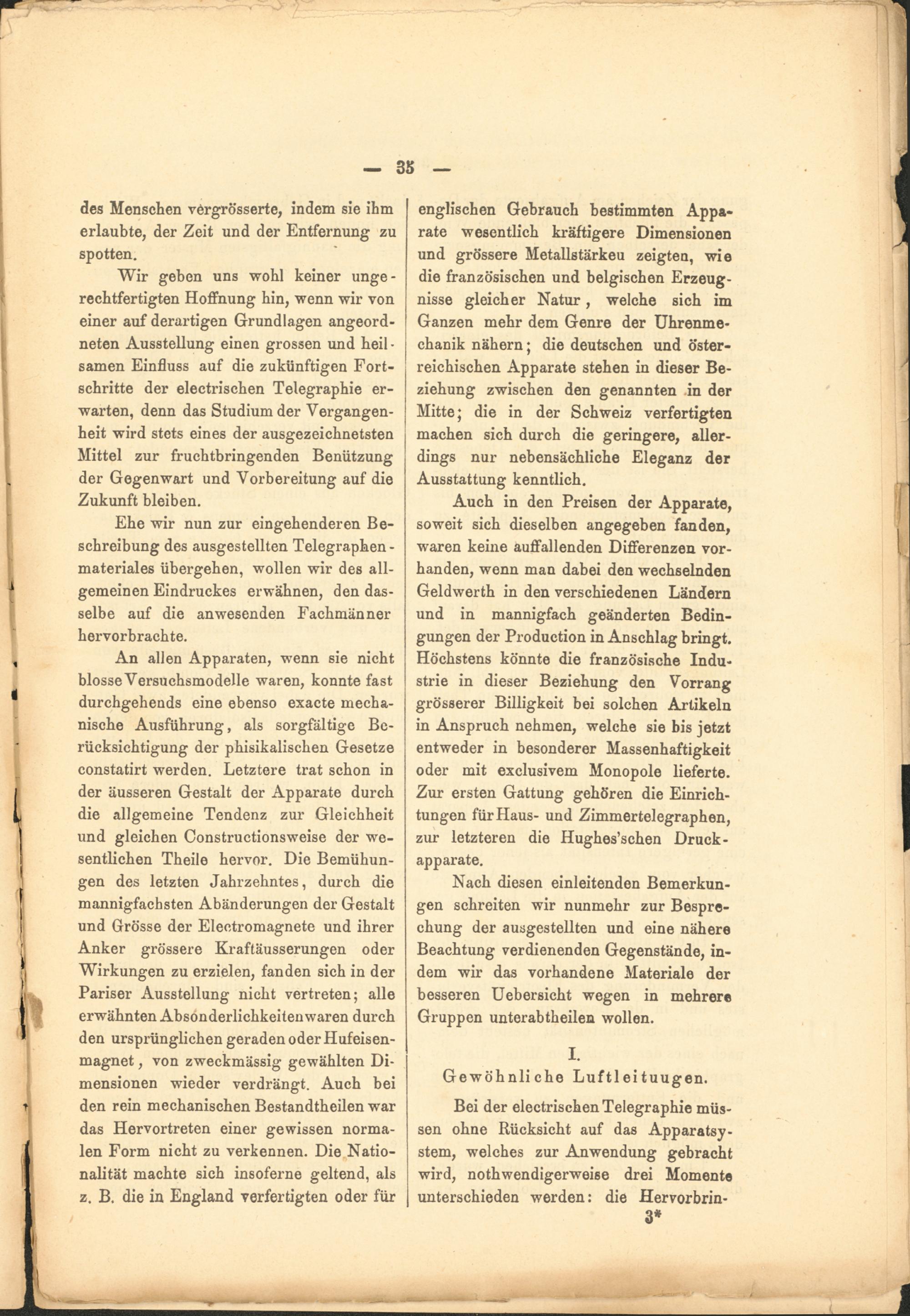 Ehe wir nun zur eingehenderen Beschreibung des ausgestellten Telegraphen - materiales übergehen, wollen wir des allgemeinen Eindruckes erwähnen, den dasselbe auf die anwesenden Fachmänner hervorbrachte.