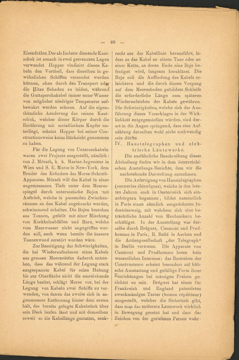 Für die Legung von Unterseekabeln waren zwei Projecte ausgestellt, nämlich : von J. Mörath, k. k. Marine-Ingenieur in Wien und S. E. Morse in New-York, dem Bruder des Erfinders des Morse-Schreib- Apparates. Mörath will das Kabel in einer angemessenen Tiefe unter dem Meeresspiegel durch unterseeische Bojen mit Auftrieb, welche in passenden Zwischenräumen an den Kabel angebracht werden, schwimmend erhalten. Die Bojen bestehen aus Tonnen, gefüllt mit einer Mischung von Korkholzabfällen und Harz, welche vom Meerwasser nicht angegriffen werden soll, auch wenn bereits die äussere Tonnenwand zerstört worden wäre.