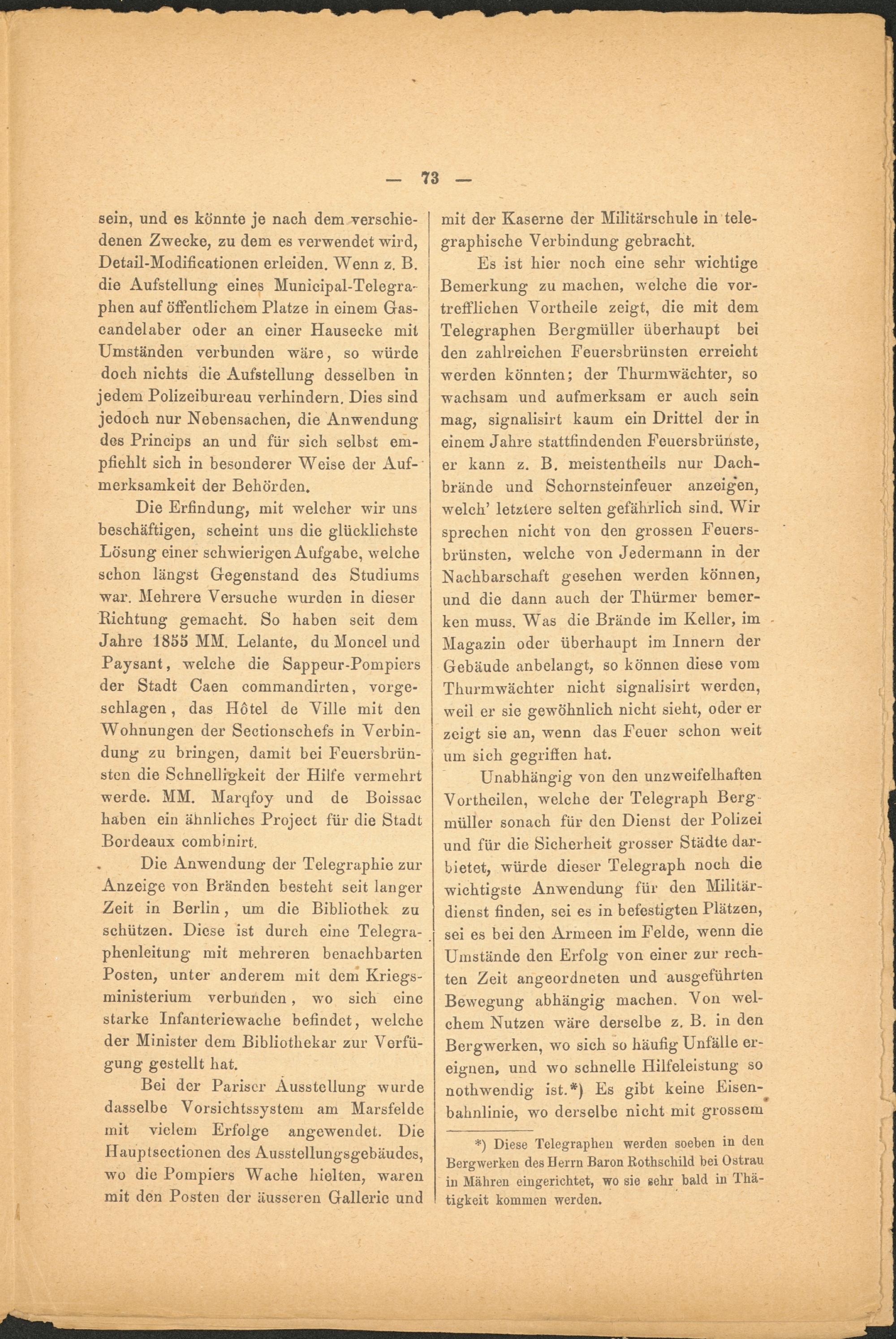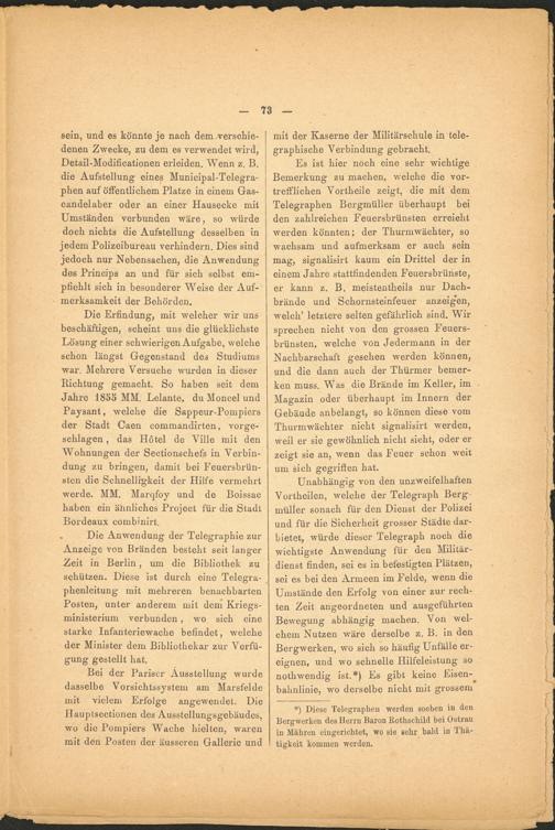 , Die Anwendung der Telegraphie zur Anzeige von Bränden besteht seit langer Zeit in Berlin, um die Bibliothek zu schützen. Diese ist durch eine Telegraphenleitung mit mehreren benachbarten Posten, unter anderem mit dem Kriegsministerium verbunden, wo sich eine starke Infanteriewache befindet, welche der Minister dem Bibliothekar zur Verfügung gestellt hat.