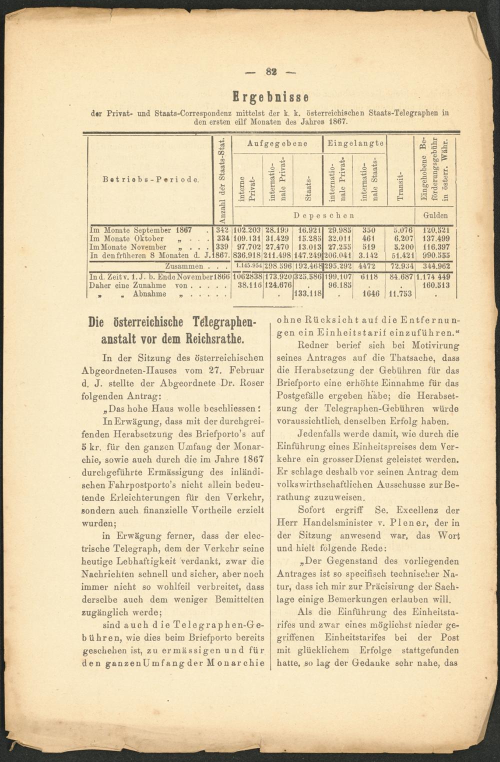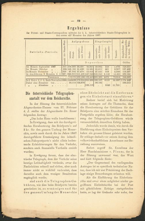 In Erwägung, dass mit der durchgreifenden Herabsetzung des Briefporto’s auf 5 kr. für den ganzen Umfang der Monarchie, sowie auch durch die im Jahre 1867 durchgeführte Ermässigung des inländischen Fahrpostporto’s nicht allein bedeutende Erleichterungen für den Verkehr, sondern auch finanzielle Vortheile erzielt wurden;