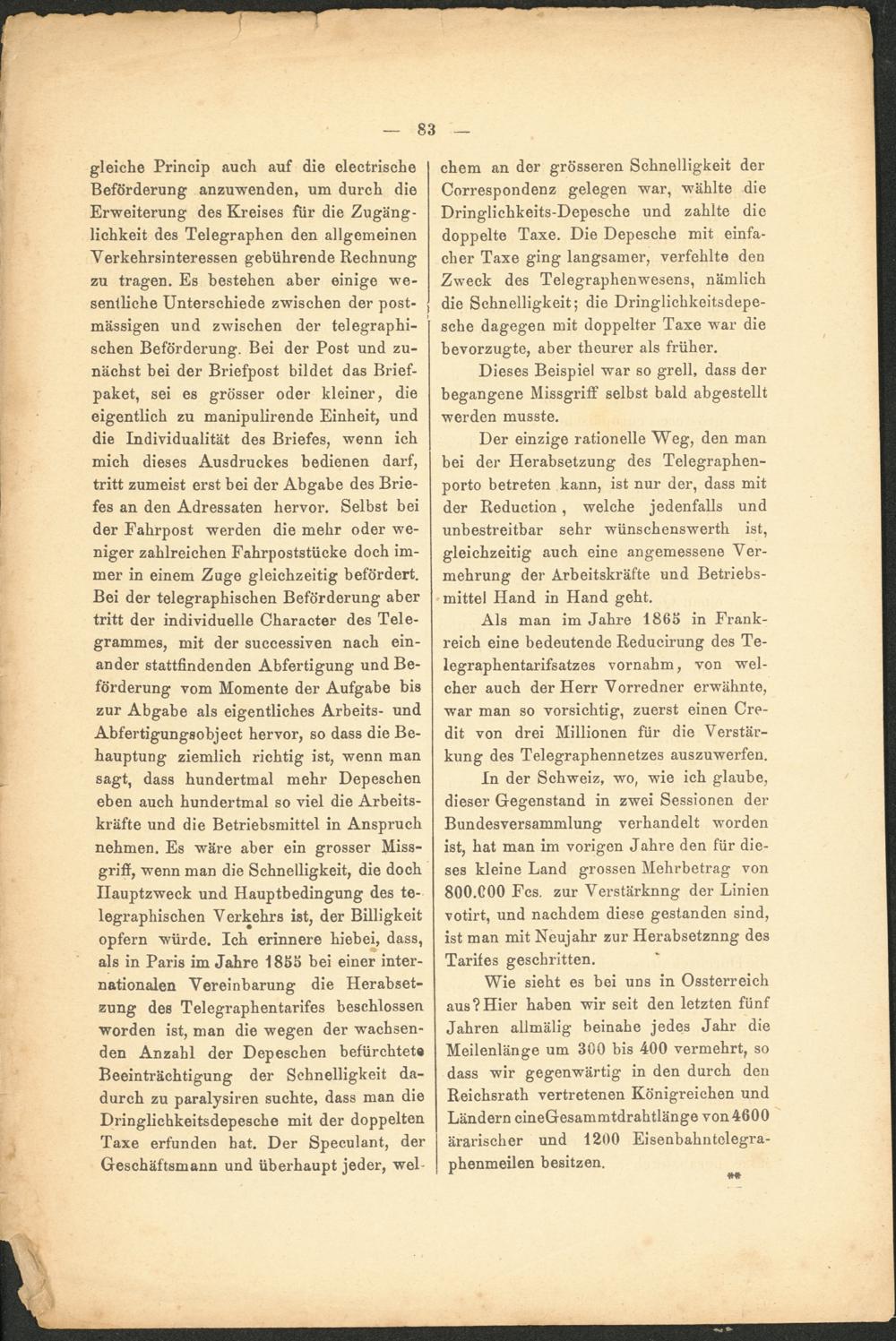 gleiche Princip auch auf die electrische Beförderung anzuwenden, um durch die Erweiterung des Kreises für die Zugänglichkeit des Telegraphen den allgemeinen Verkehrsinteressen gebührende Rechnung zu tragen. Es bestehen aber einige wesentliche Unterschiede zwischen der post- mässigen und zwischen der telegraphischen Beförderung. Bei der Post und zunächst bei der Briefpost bildet das Briefpaket, sei es grösser oder kleiner, die eigentlich zu manipulirende Einheit, und die Individualität des Briefes, wenn ich mich dieses Ausdruckes bedienen darf, tritt zumeist erst bei der Abgabe des Briefes an den Adressaten hervor. Selbst bei der Fahrpost werden die mehr oder weniger zahlreichen Fahrpoststücke doch immer in einem Zuge gleichzeitig befördert. Bei der telegraphischen Beförderung aber tritt der individuelle Character des Tele- grammes, mit der successiven nach einander stattfindenden Abfertigung und Beförderung vom Momente der Aufgabe bis zur Abgabe als eigentliches Arbeits- und Abfertigungsobject hervor, so dass die Behauptung ziemlich richtig ist, wenn man sagt, dass hundertmal mehr Depeschen eben auch hundertmal so viel die Arbeitskräfte und die Betriebsmittel in Anspruch nehmen. Es wäre aber ein grosser Missgriff, wenn man die Schnelligkeit, die doch Hauptzweck und Hauptbedingung des telegraphischen Verkehrs ist, der Billigkeit opfern würde. Ich erinnere hiebei, dass, als in Paris im Jahre 18S5 bei einer internationalen Vereinbarung die Herabsetzung des Telegraphentarifes beschlossen worden ist, man die wegen der wachsenden Anzahl der Depeschen befürchtete Beeinträchtigung der Schnelligkeit dadurch zu paralysiren suchte, dass man die Dringlichkeitsdepesche mit der doppelten Taxe erfunden hat. Der Speculant, der Geschäftsmann und überhaupt jeder, wel