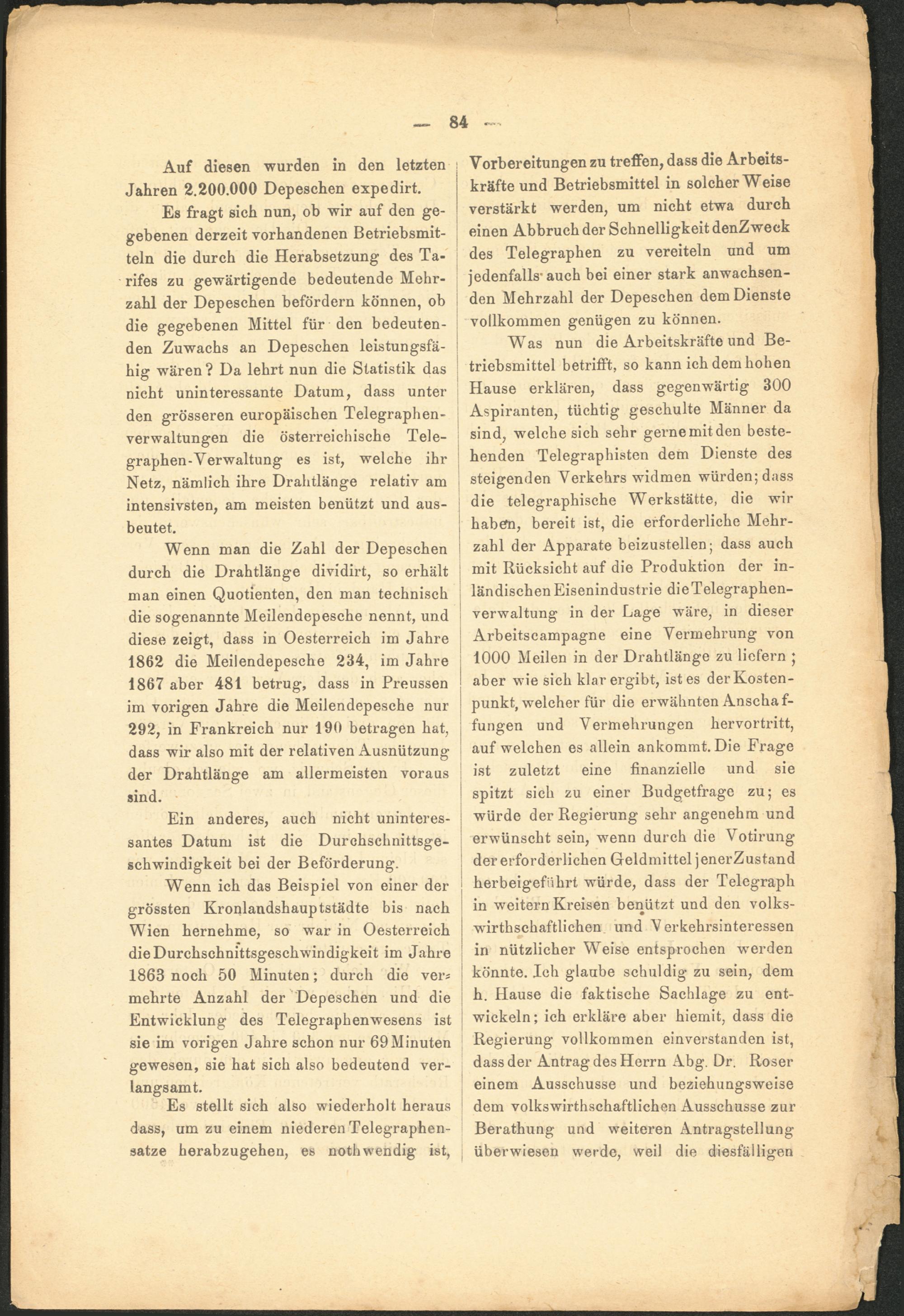 Was nun die Arbeitskräfte und Betriebsmittel betrifft, so kann ich dem hohen Hause erklären, dass gegenwärtig 300 Aspiranten, tüchtig geschulte Männer da sind, welche sich sehr gerne mit den bestehenden Telegraphisten dem Dienste des steigenden Verkehrs widmen würden; dass die telegraphische Werkstätte, die wir habefn, bereit ist, die erforderliche Mehrzahl der Apparate beizustellen; dass auch mit Rücksicht auf die Produktion der inländischen Eisenindustrie die Telegraphenverwaltung in der Lage wäre, in dieser Arbeitscampagne eine Vermehrung von 1000 Meilen in der Drahtlänge zu liefern ; aber wie sich klarergibt, ist es der Kostenpunkt, welcher für die erwähnten Anschaffungen und Vermehrungen hervortritt, auf welchen es allein ankommt. Die Frage ist zuletzt eine finanzielle und sie spitzt sich zu einer Budgetfrage zu; es würde der Regierung sehr angenehm und erwünscht sein, wenn durch die Votirung der erforderlichen Geldmittel jenerZustand herbeigeführt wrnrde, dass der Telegraph