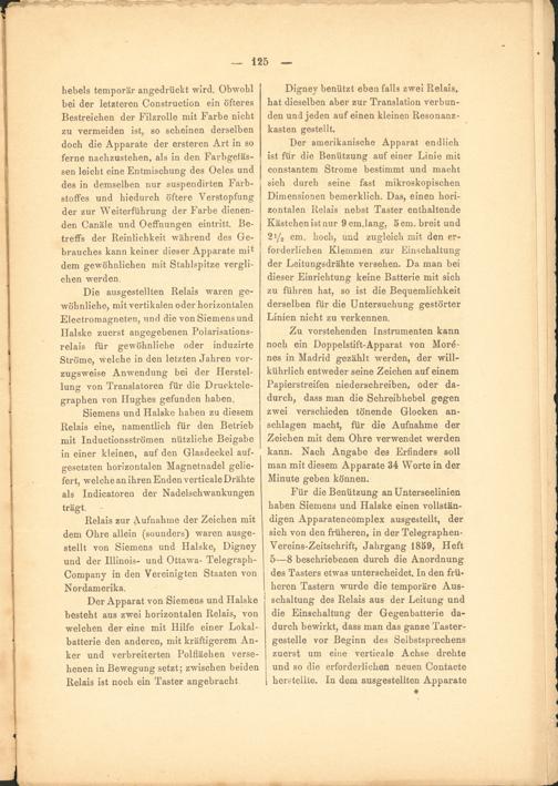 Relais zur Aufnahme der Zeichen mit dem Ohre allein (sounders) waren ausgestellt von Siemens und Halske, Digney und der Illinois- und Ottaw r a- Telegraph- Company in den Vereinigten Staaten von Nordamerika.