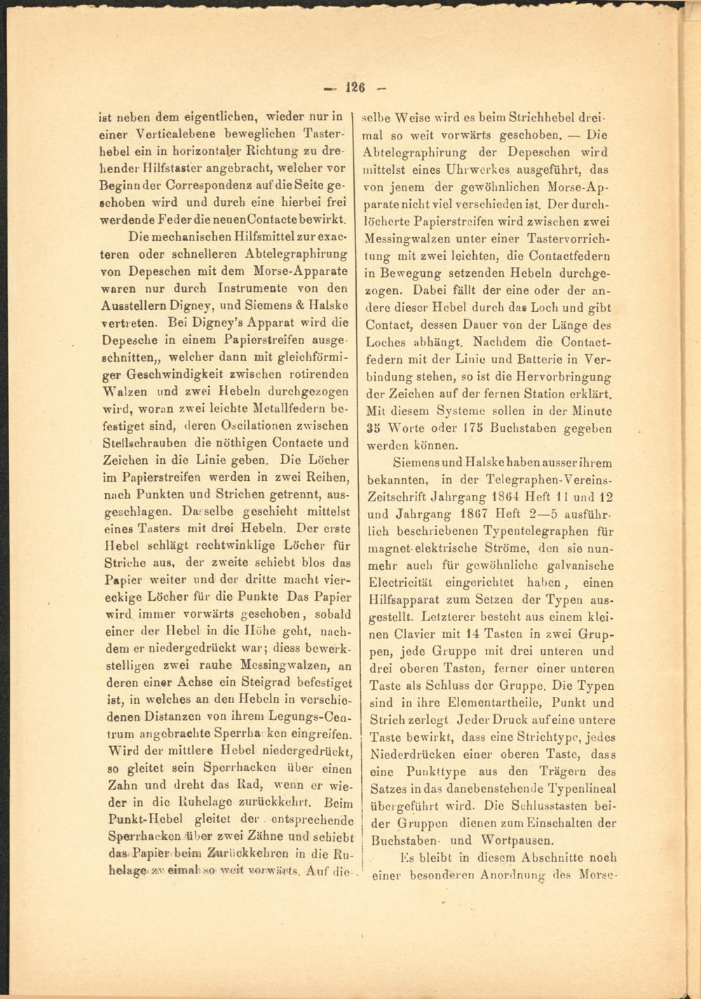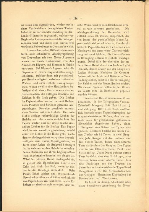 selbe Weise wird es beim Strichhebel dreimal so weit vorwärts geschoben. — Die Abtelegraphirung der Depeschen wird mittelst eines Uhrwerkes ausgeführt, das von jenem der gewöhnlichen Morse-Ap- parate nicht viel verschieden ist. Der durchlöcherte Papierstreifen wird zwischen zwei Messingwalzen unter einer Tastervorrichtung mit zwei leichten, die Contactfedern in Bewegung setzenden Hebeln durchgezogen. Dabei fällt der eine oder der andere dieser Hebel durch das Loch und gibt Contact, dessen Dauer von der Länge des Loches abhängt. Nachdem die Contactfedern mit der Linie und Batterie in Verbindung stehen, so ist die Hervorbringung der Zeichen auf der fernen Station erklärt. Mit diesem Systeme sollen in der Minute 35 Worte oder 175 Buchstaben gegeben werden können.