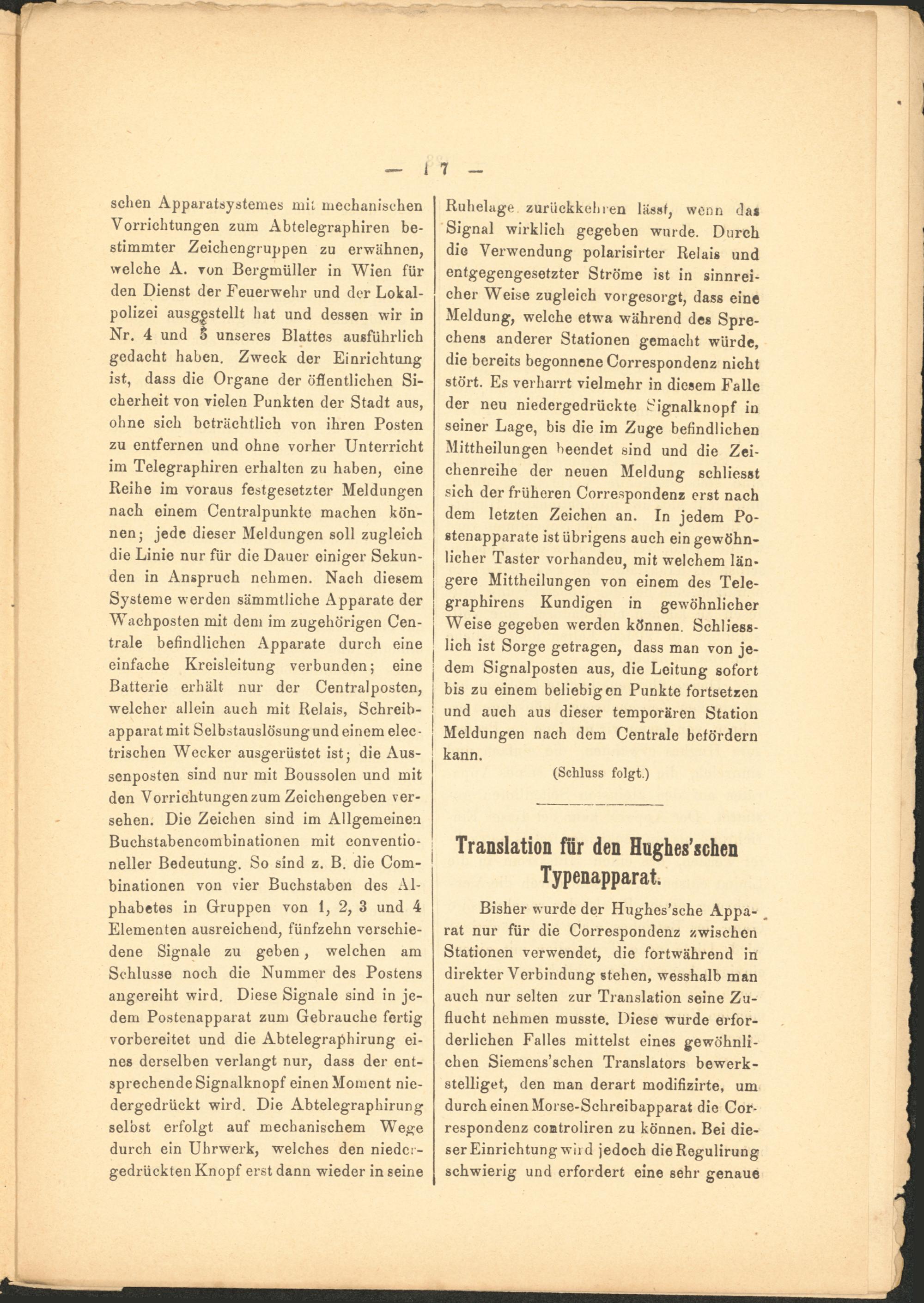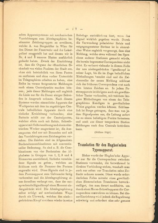 Bisher wurde der Hughes’sche Appa- ^ rat nur für die Correspondenz zwischen Stationen verwendet, die fortwährend in direkter Verbindung stehen, wesshalb man auch nur selten zur Translation seine Zuflucht nehmen musste. Diese wurde erforderlichen Falles mittelst eines gewöhnlichen Siemens’schen Translators bewerkstelliget, den man derart modifizirte, um durch einen Morse-Schreibapparat die Correspondenz coatroliren zu können. Bei dieser Einrichtung wird jedoch die Regulirung schwierig und erfordert eine sehr genaue