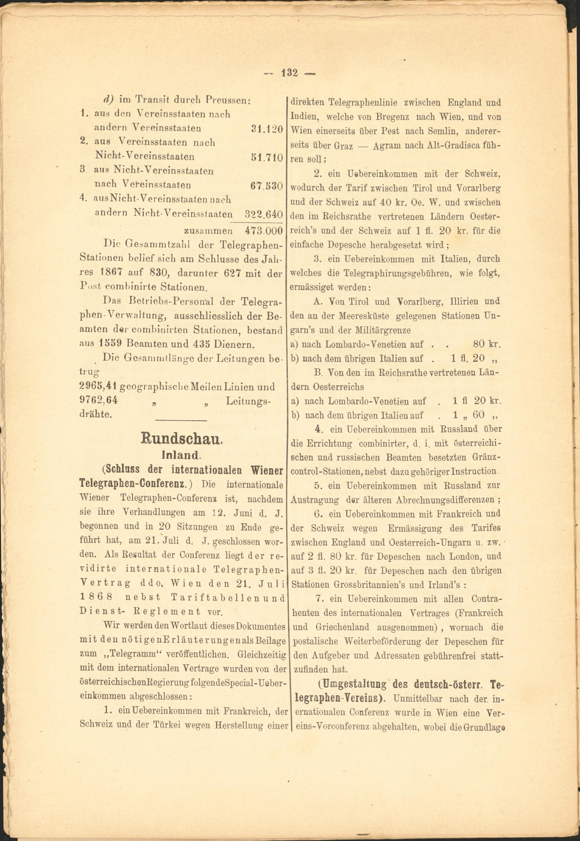 (Schluss der internationalen Wiener Telegraphen-Conferenz. ) Die internationale Wiener Telegraphen-Conferenz ist, nachdem sie ihre Verhandlungen am 12. Juni d. J. begonnen und in 20 Sitzungen zu Ende geführt hat, am 21. Juli d. J. geschlossen worden. Als Resultat der Conferenz liegt der re- vidirte internationale Telegraphen- Vertrag d d o, Wien den 21. Juli 1868 nebst Tariftabellenund Dienst- Reglement vor.
