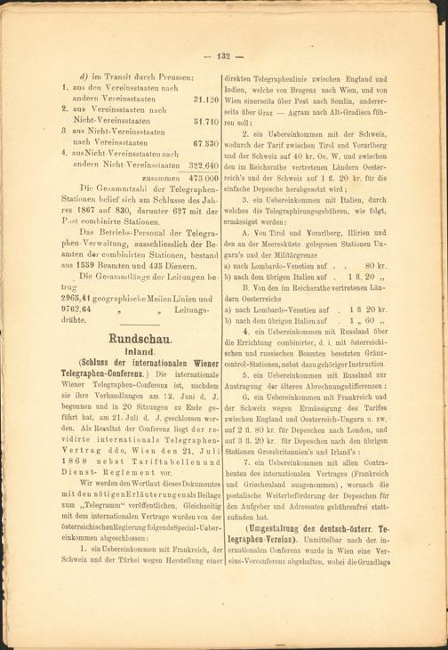 (Umgestaltung des deutsch-österr. Te- legraphen-Vereins). Unmittelbar nach der. in- ernationalen Conferenz wurde in Wien eine Ver- eins-Vorconferenz abgehalten, wobei die Grundlage