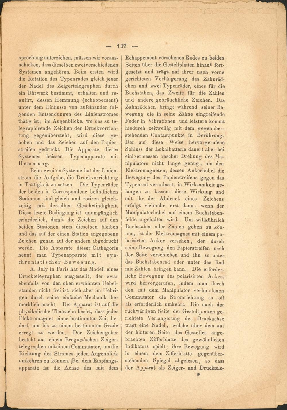 A. Joly in Paris hat das Modell eines Drucktelegraphen ausgestellt, der zwar ebenfalls von den oben erwähnten Uebel- ständcn nicht frei ist, sich aber im Uebri- gen durch seine einfache Mechanik be- merklich macht. Der Apparat ist auf die physikalische Thatsache basirt, dass jeder Elektromagnet einer bestimmten Zeit bedarf, um bis zu einem bestimmten Grade erregt zu werden. Der Zeichengeber besteht aus einem Breguet’schen Zeigertelegraphen mit einem Commutator, um die Richtung des Stromes jeden Augenblick umkehren zu können. [Bei dem Empfangsapparate ist die Achse des mit dem