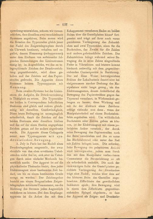 sprechung unterziehen, müssen wir vorausschicken, dass dieselben zwei verschiedenen Systemen angehören. Beim ersten wird die Rotation des Typenrades gleich jener der Nadel des Zeigertelegraphen durch ein Uhrwerk bestimmt, erhalten und re- gulirt, dessen Hemmung (echappement) unter dem Einflüsse von aufeinander folgenden Entsendungen des Linienstromes thätig ist; im Augenblicke, wo das zu te- legraphirende Zeichen der Druckvorrichtung gegenübersteht, wird diese gehoben und das Zeichen auf den Papierstreifen gedruckt. Die Apparate dieses Systemes heissen Typenapparate mit Hemmung.