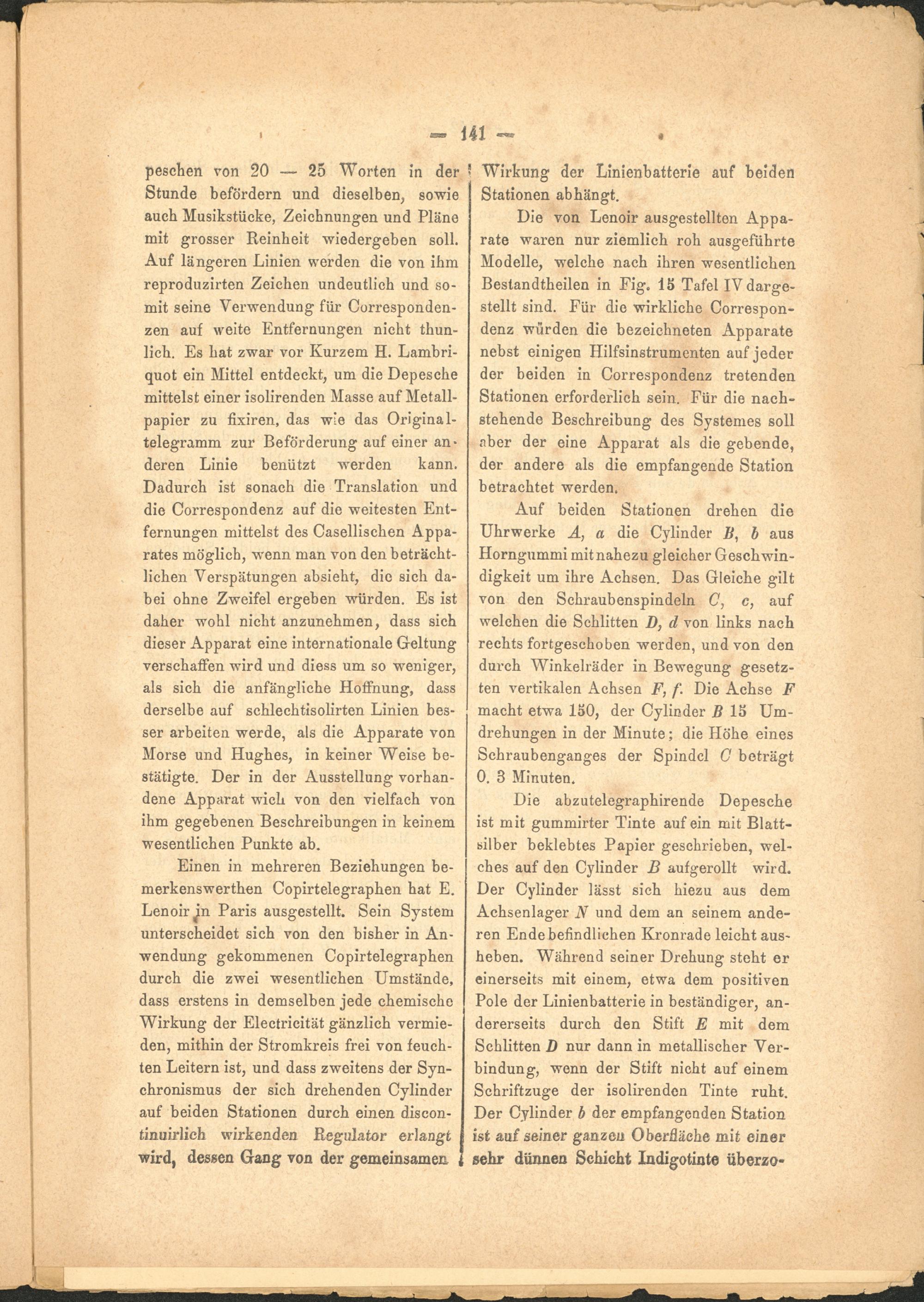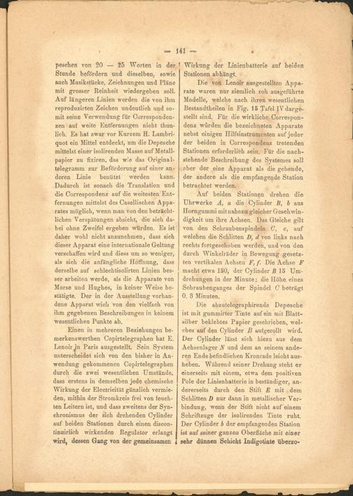 Einen in mehreren Beziehungen be- merkenswerthen Copirtelegraphen hat E. Lenoir^n Paris ausgestellt. Sein System unterscheidet sich von den bisher in Anwendung gekommenen Copirtelegraphen durch die zwei wesentlichen Umstände, dass erstens in demselben jede chemische Wirkung der Electricität gänzlich vermieden, mithin der Stromkreis frei von feuchten Leitern ist, und dass zweitens der Synchronismus der sich drehenden Cylinder auf beiden Stationen durch einen discon- tinuirlich wirkenden Regulator erlangt wird, dessen Gang von der gemeinsamen ,