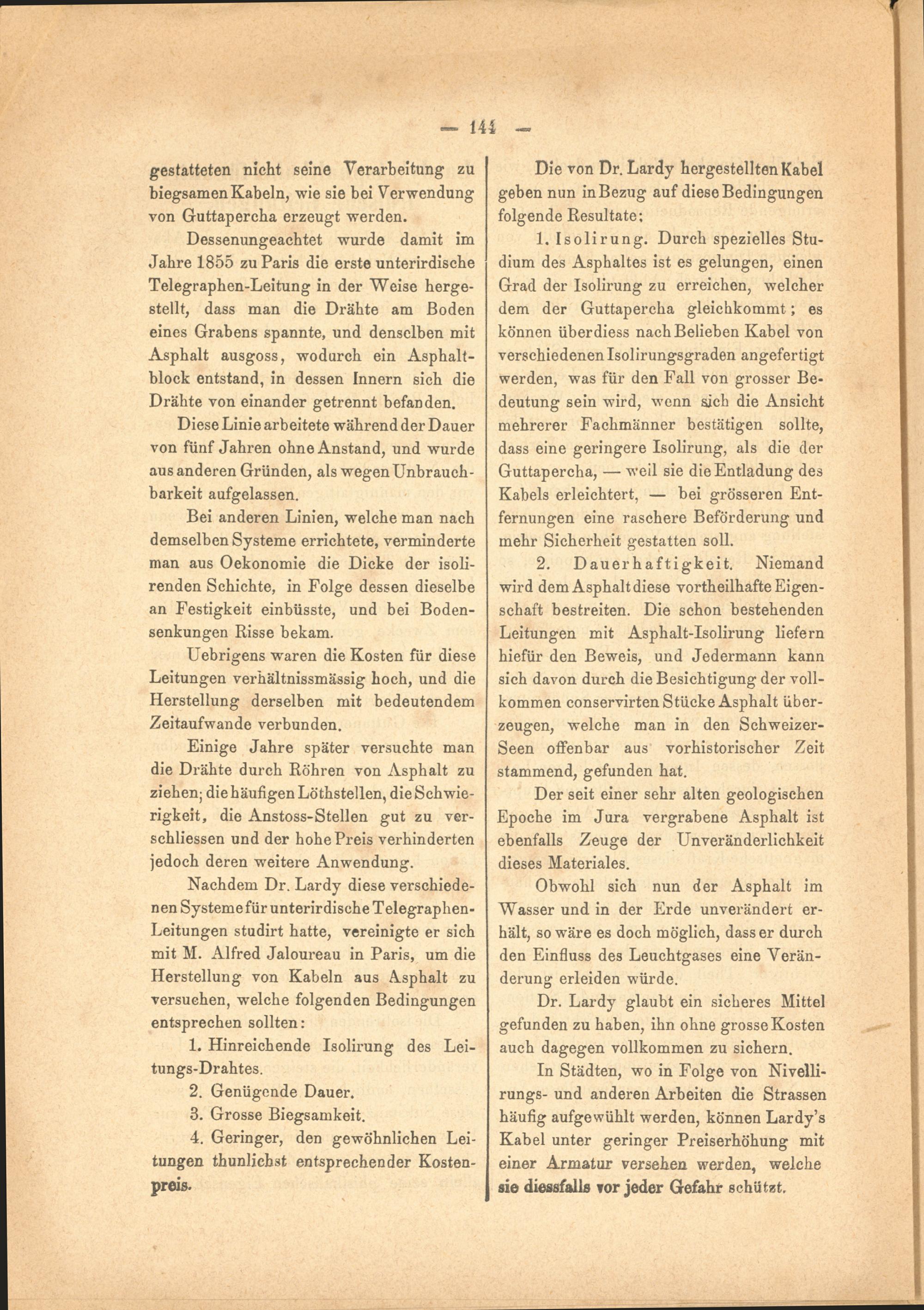 Nachdem Dr. Lardy diese verschiedenen Systeme für unterirdische Telegraphen- Leitungen studirt hatte, vereinigte er sich mit M. Alfred Jaloureau in Paris, um die Herstellung von Kabeln aus A.sphalt zu versuchen, welche folgenden Bedingungen entsprechen sollten: